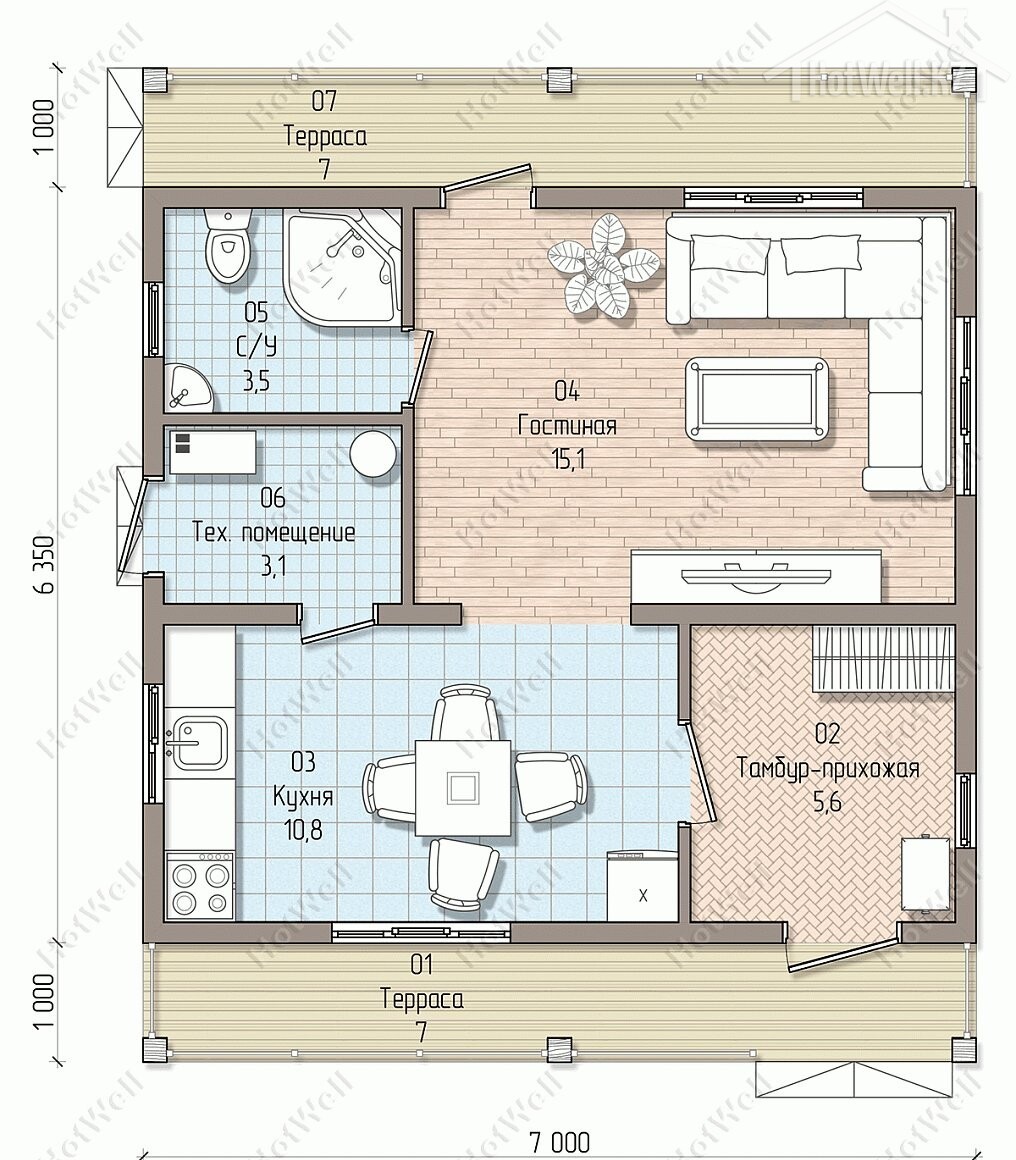 Одноэтажный дом 8 на 7 метров, общей площадью 58 м2, из СИП панелей, с бойлерной и террасой.