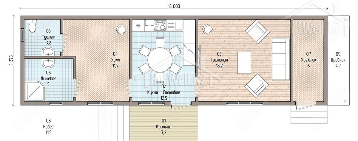 Одноэтажный дом 16 на 7 метров, общей площадью 73 м2, из СИП панелей, с бойлерной и спальней на первом этаже.