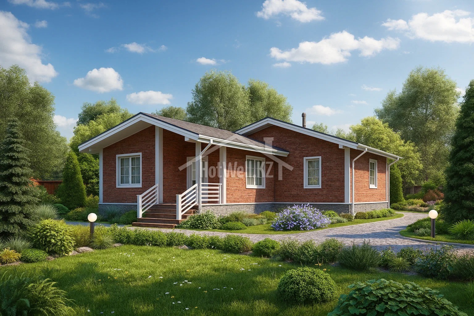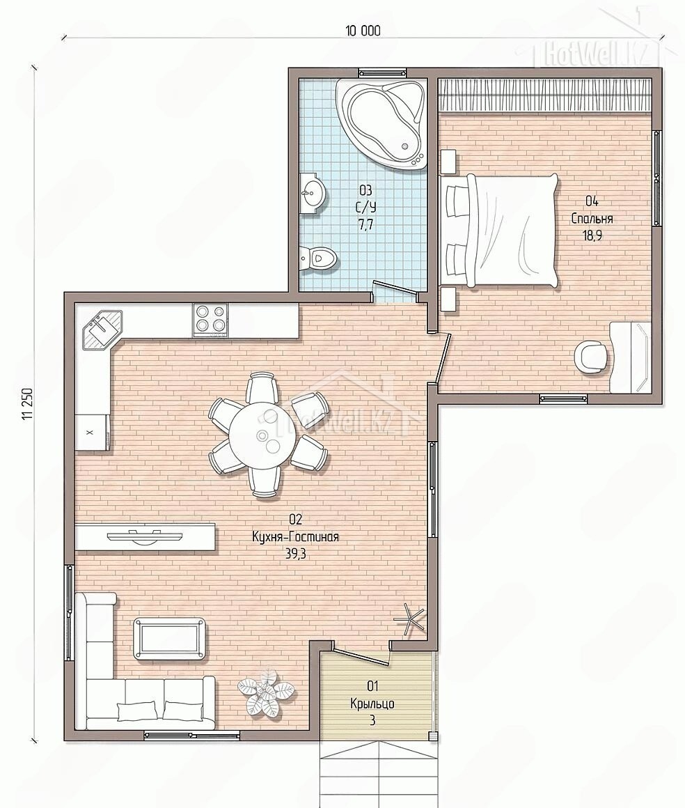 Одноэтажный дом 11 на 10 метров, общей площадью 77 м2, из СИП панелей, со спальней на первом этаже.