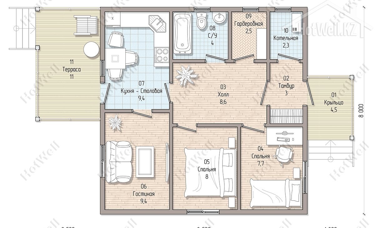 Одноэтажный дом 12 на 8 метров, общей площадью 80 м2, из СИП панелей, с бойлерной, террасой и спальней на первом этаже.