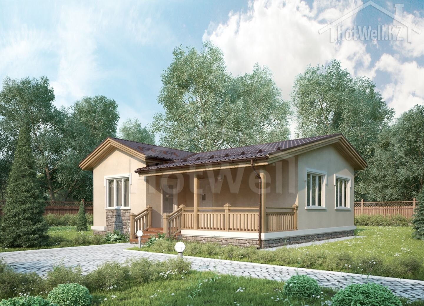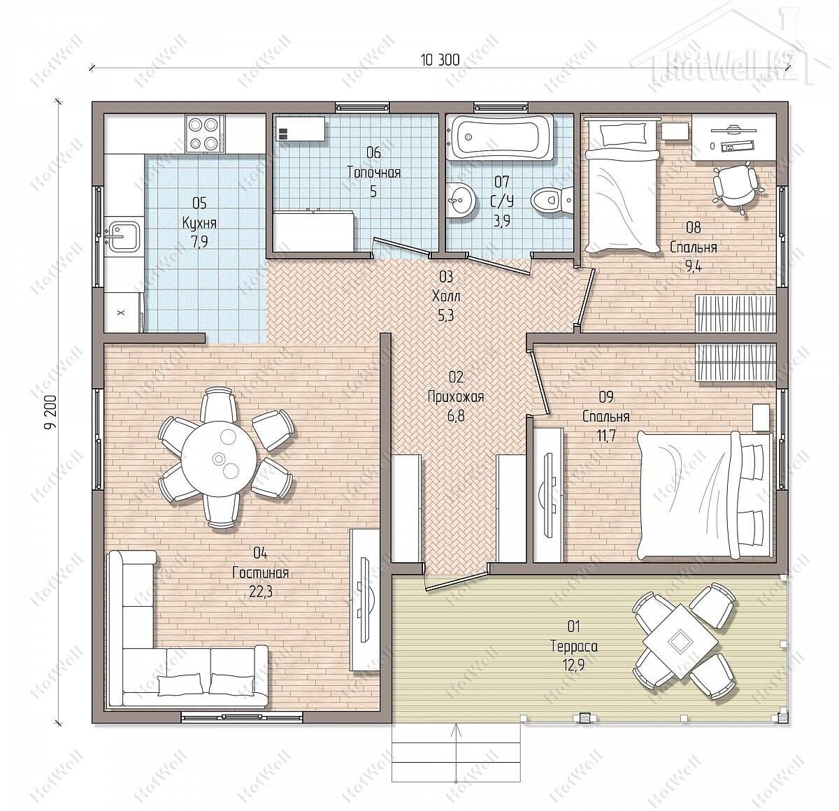 Одноэтажный дом 10 на 9 метров, общей площадью 95 м2, из СИП панелей, с бойлерной, террасой и спальней на первом этаже.