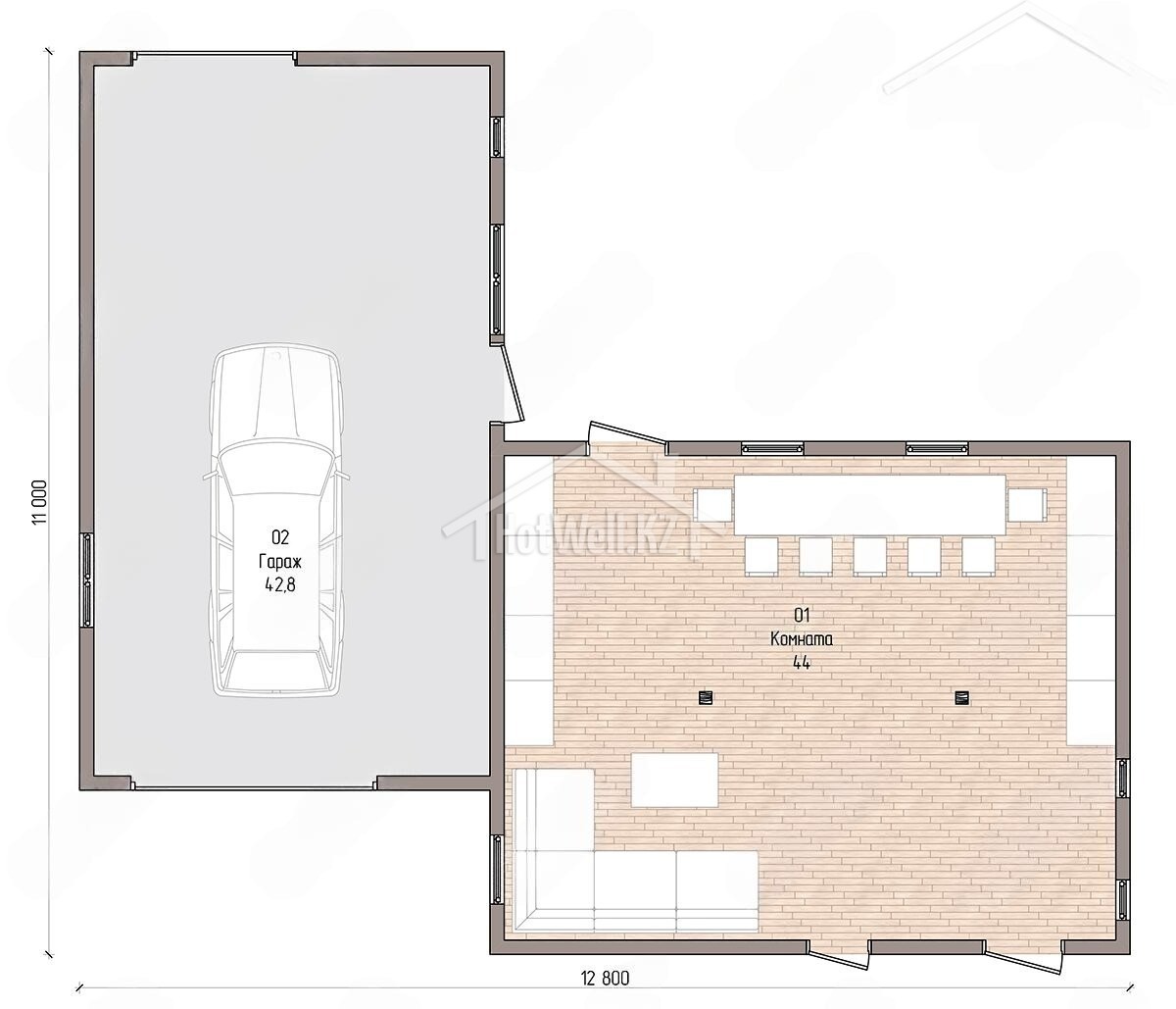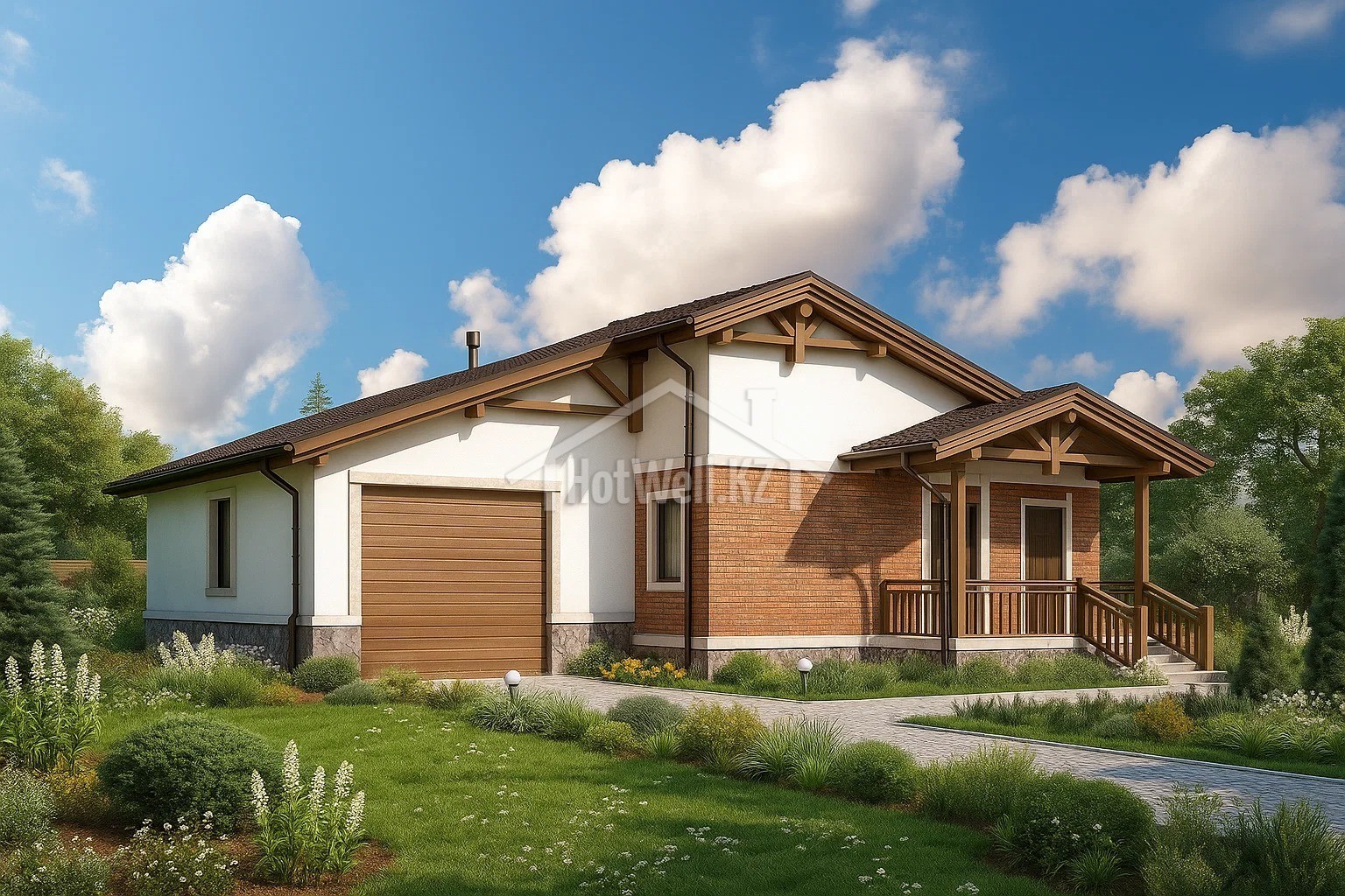 Одноэтажный дом 13 на 11 метров, общей площадью 95 м2, из СИП панелей, с гаражом и спальней на первом этаже.
