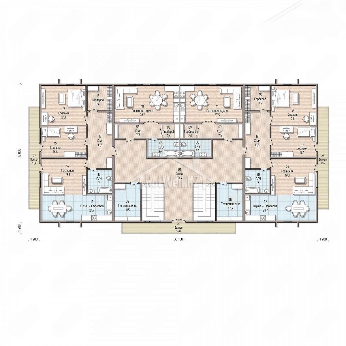 Двухэтажный дом 30 на 19 метров, общей площадью 1011 м2, из СИП панелей, с террасой, балконом, вторым светом и спальней на первом этаже.