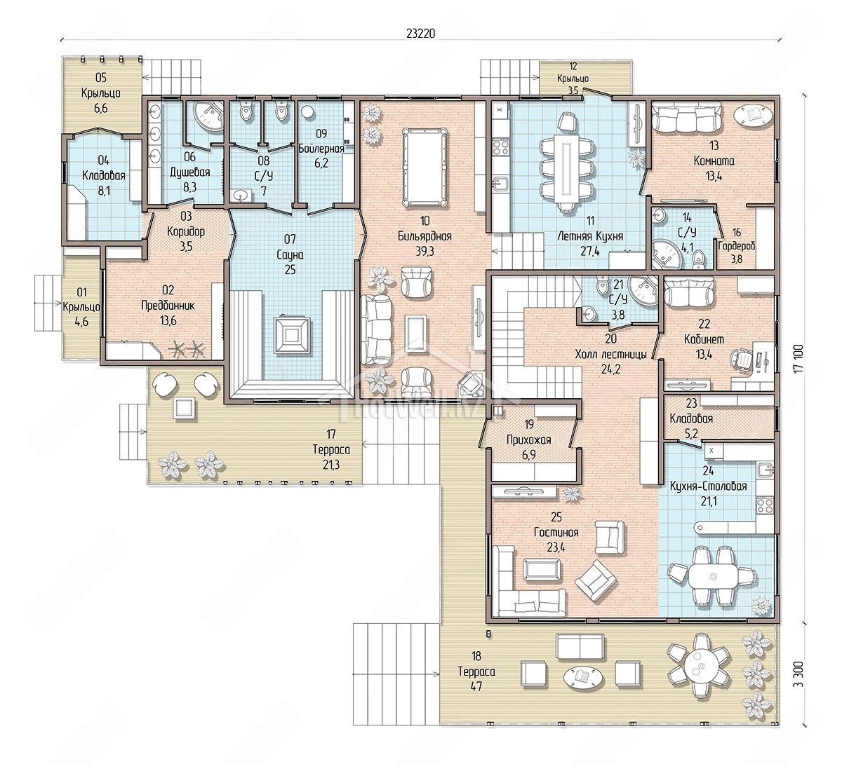 Дом с мансардой 23 на 20 метров, общей площадью 537 м2, из СИП панелей, с бойлерной, террасой и спальней на первом этаже.