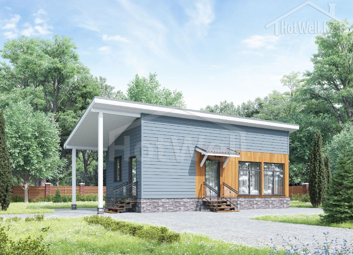 Одноэтажный дом 12 на 5 метров, общей площадью 61 м2, из СИП панелей, с бойлерной, навесом и спальней на первом этаже.