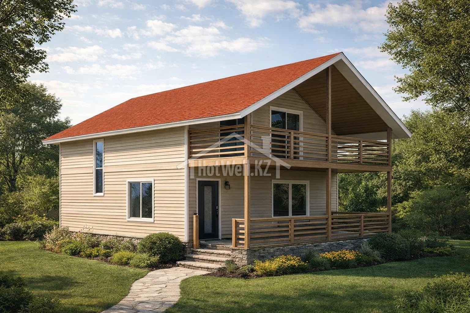 Дом имеет два этажа, благодаря чему жилое пространство можно грамотно распределить. На первом уровне обычно располагаются кухня, гостиная и основные помещения, а на втором — спальни и личные комнаты.