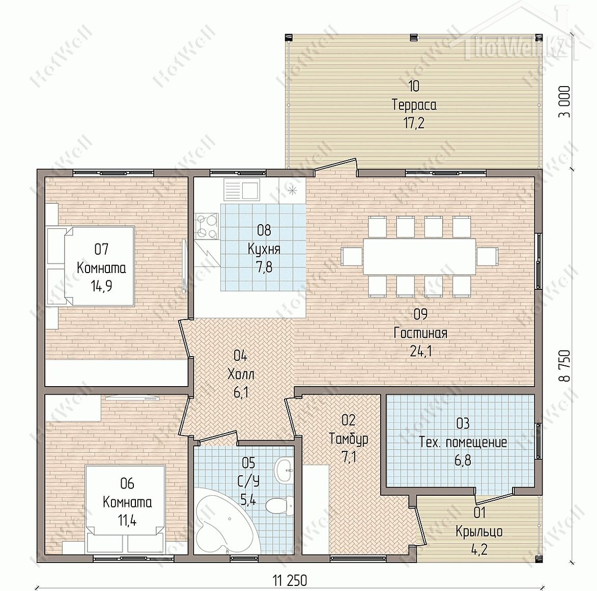 Одноэтажный дом 12 на 11 метров, общей площадью 116 м2, из СИП панелей, с бойлерной, террасой и спальней на первом этаже.