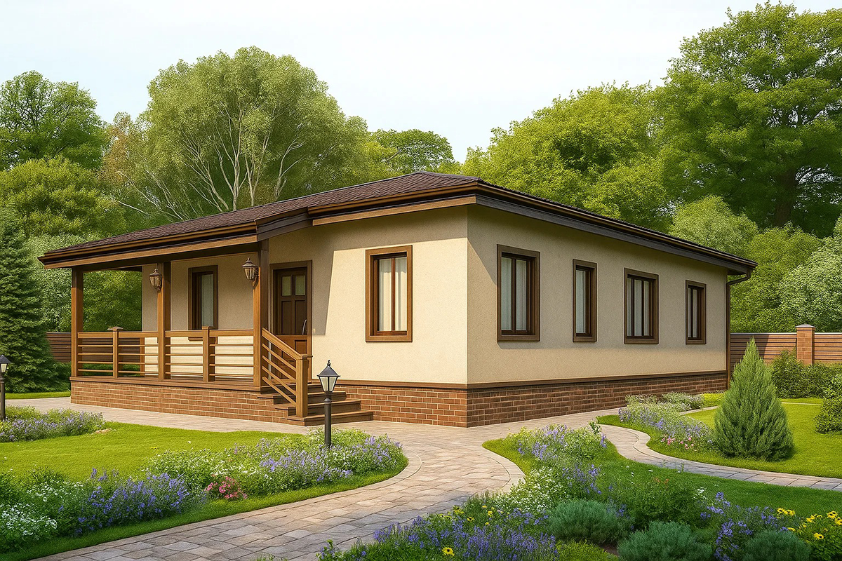 Одноэтажный дом 14 на 9 метров, общей площадью 120 м2, из СИП панелей, с террасой и спальней на первом этаже.