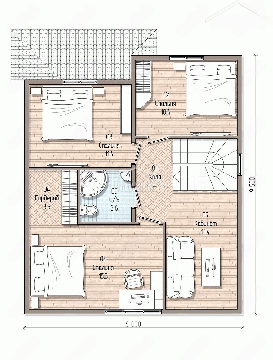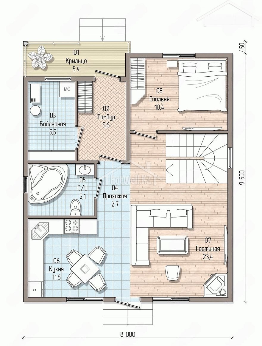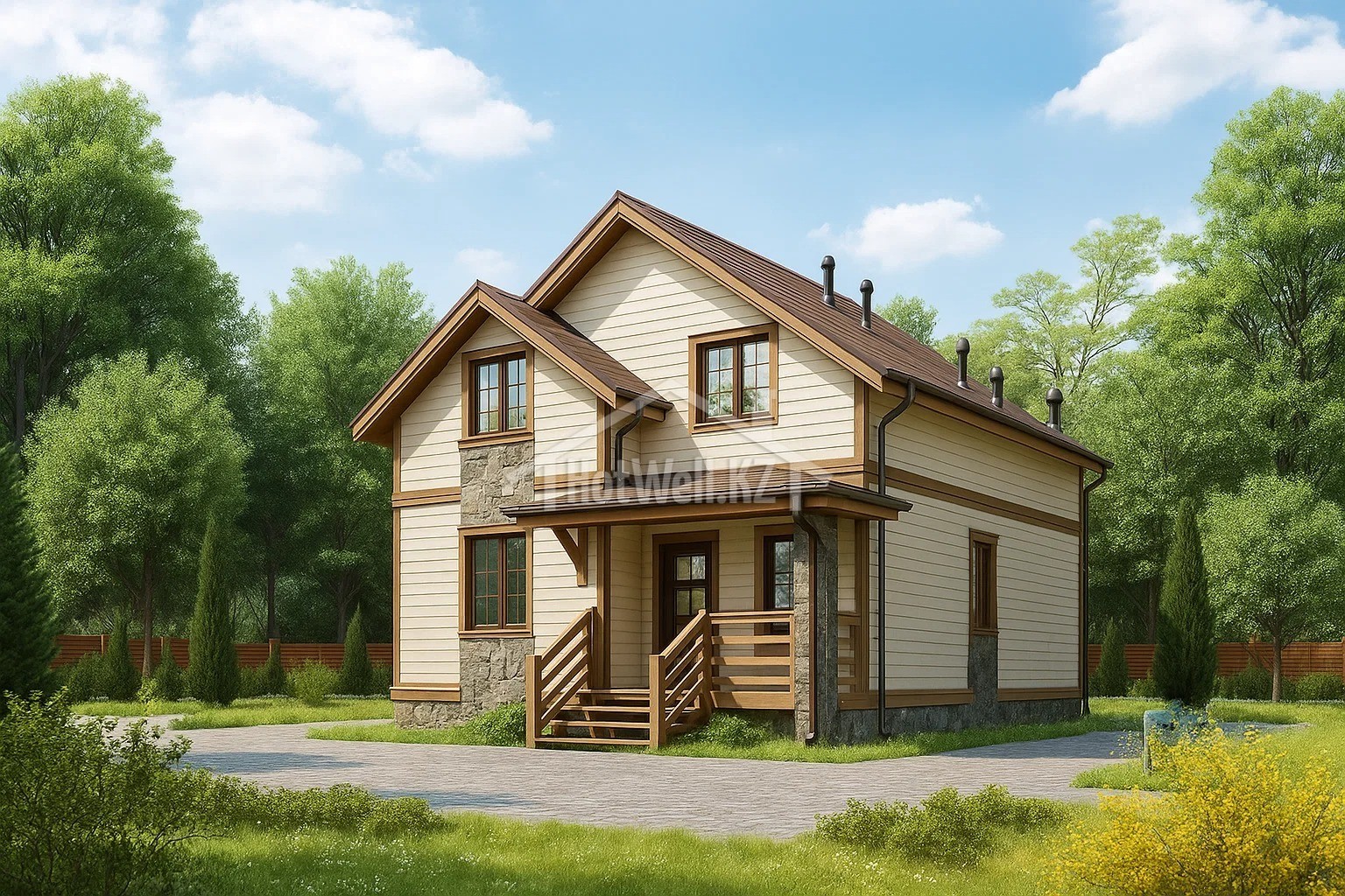 Дом с мансардой 10 на 8 метров, общей площадью 150 м2, из СИП панелей, с бойлерной и спальней на первом этаже.