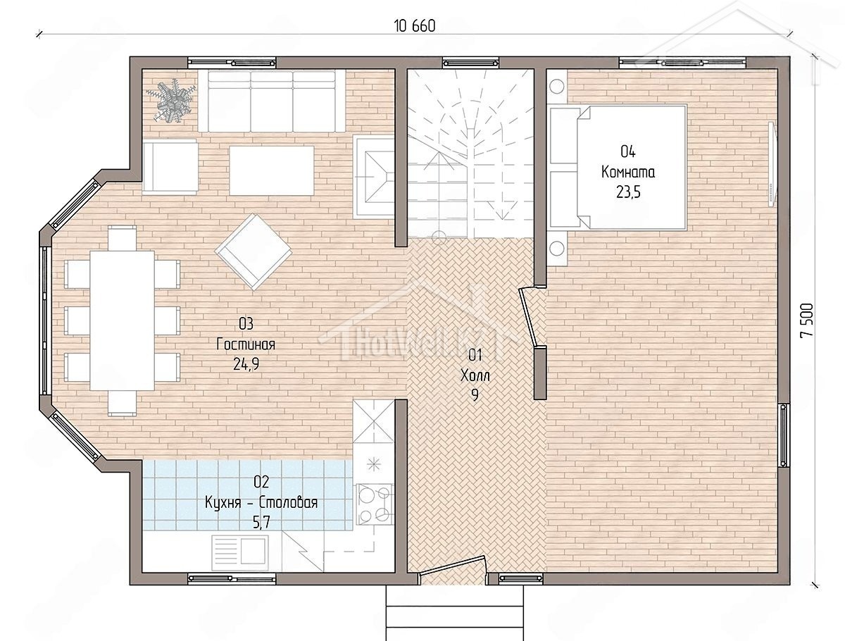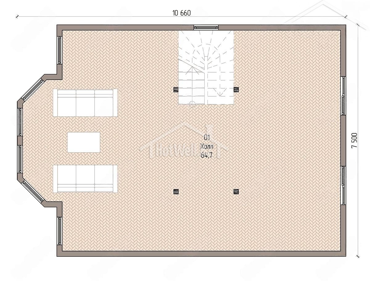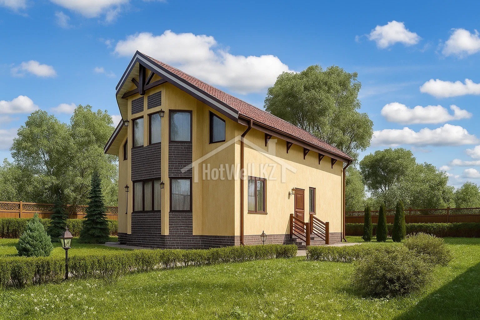 Дом с мансардой 11 на 8 метров, общей площадью 152 м2, из СИП панелей, с эркером и спальней на первом этаже.