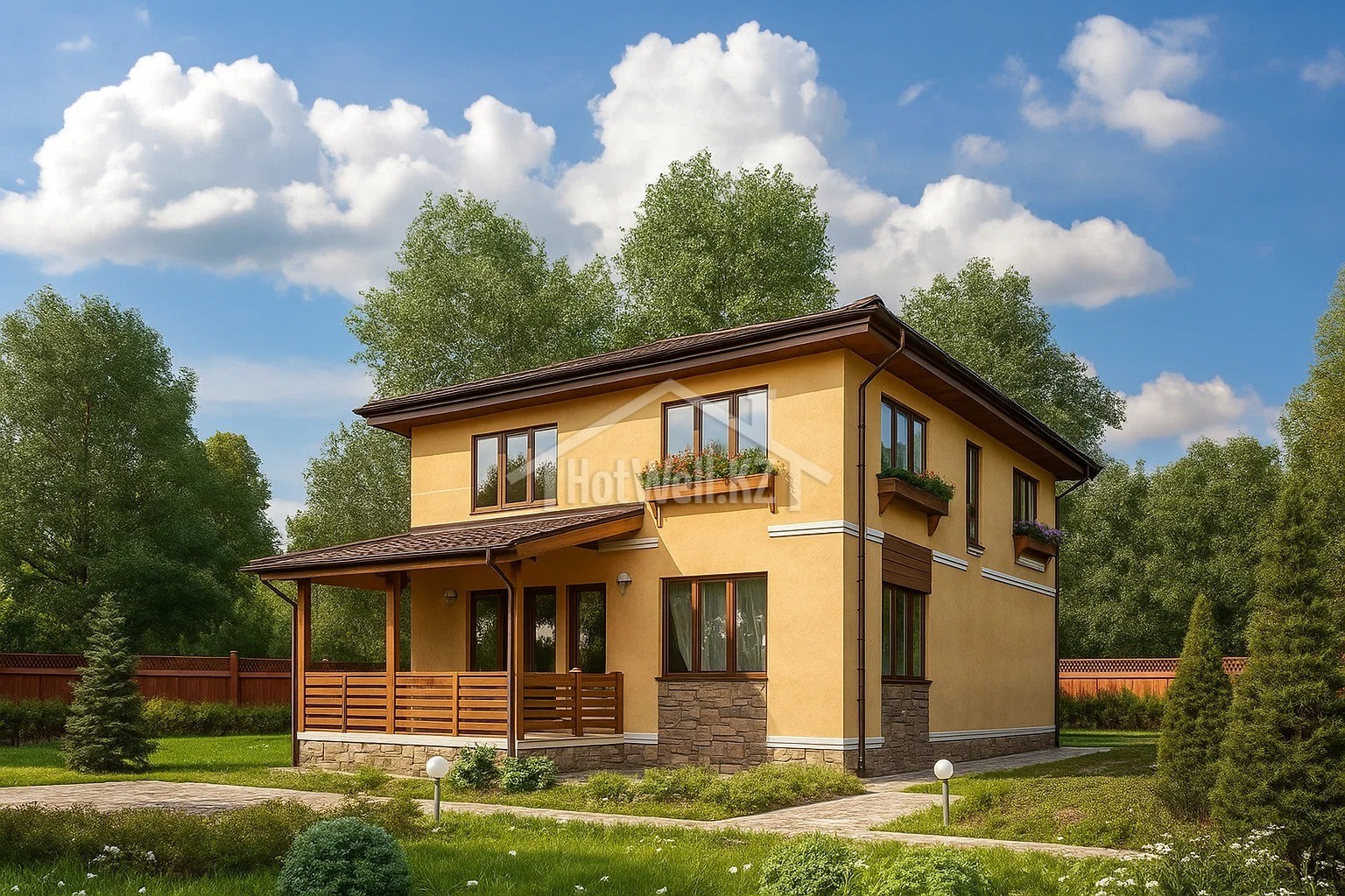Двухэтажный дом 15 на 8 метров, общей площадью 158 м2, из СИП панелей, с бойлерной, террасой и спальней на первом этаже.