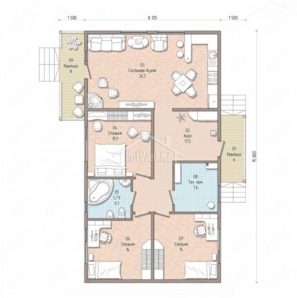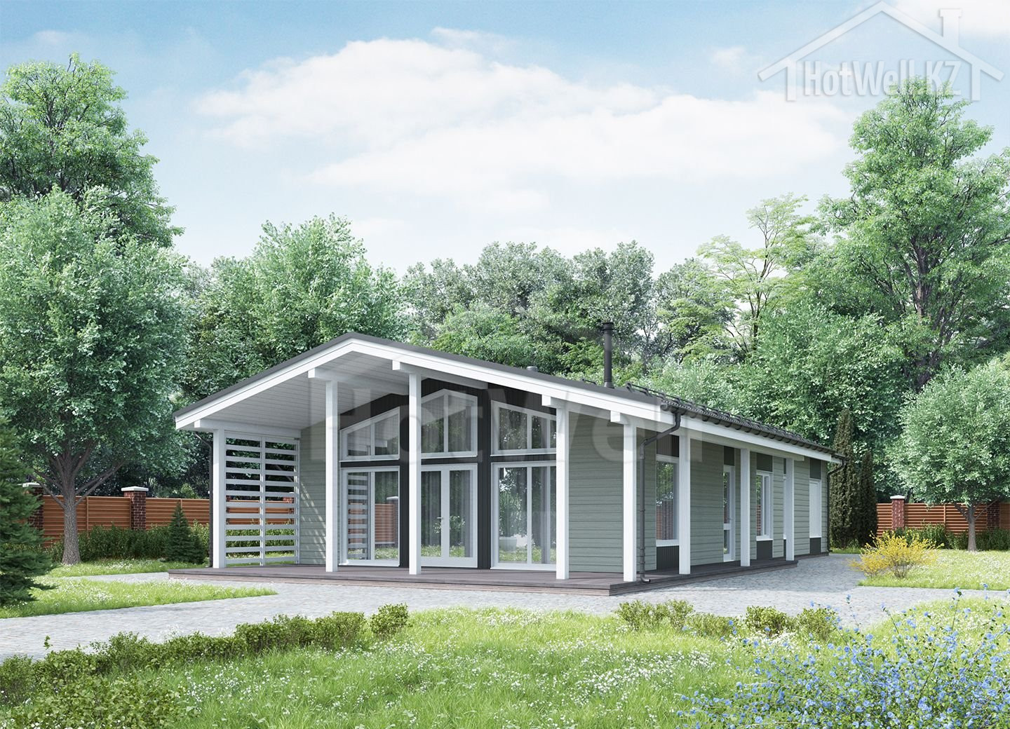 Одноэтажный дом общей площадью 172 м2, из СИП панелей, с бойлерной, террасой и спальней на первом этаже.