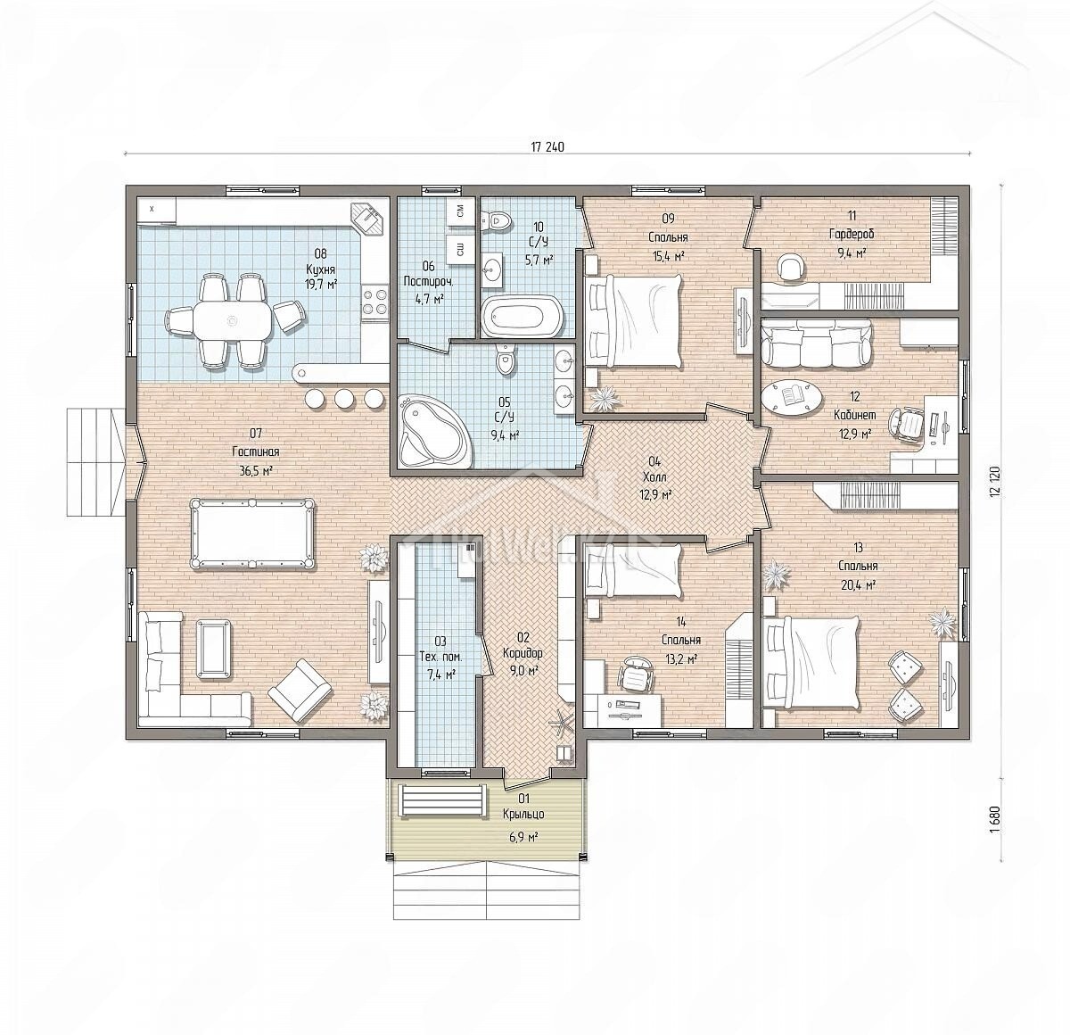 Одноэтажный дом 17 на 14 метров, общей площадью 202 м2, из СИП панелей, с бойлерной и спальней на первом этаже.