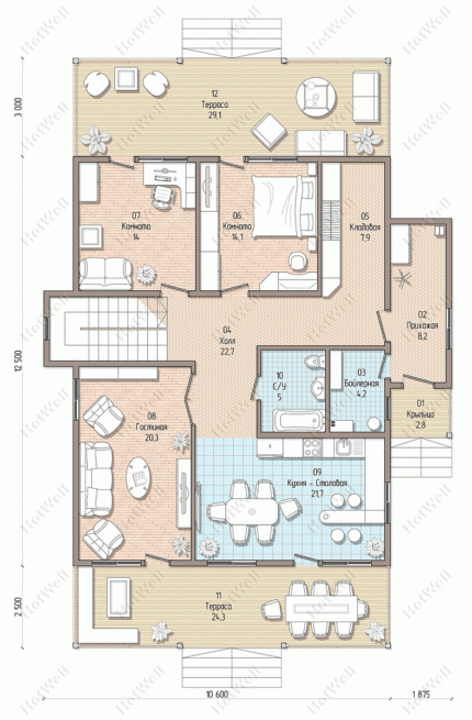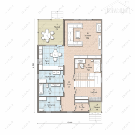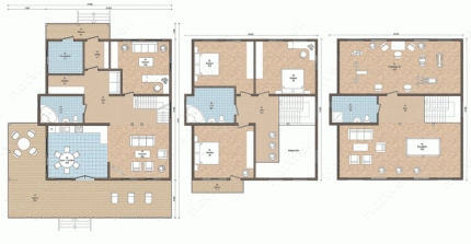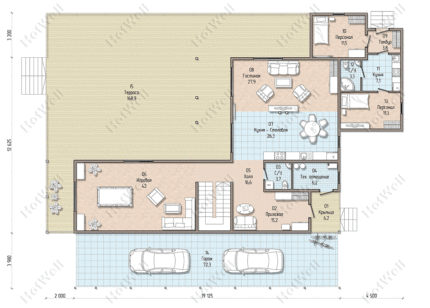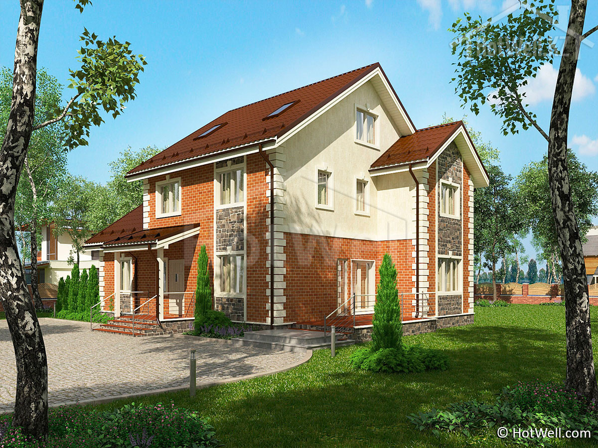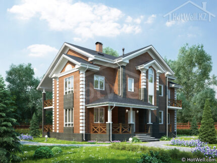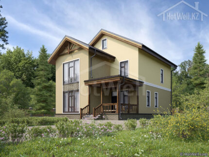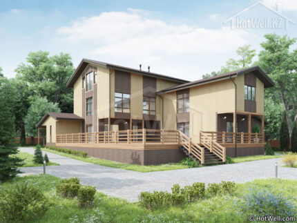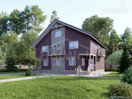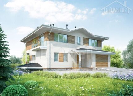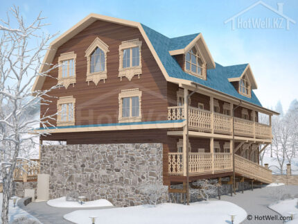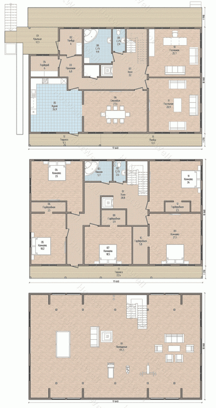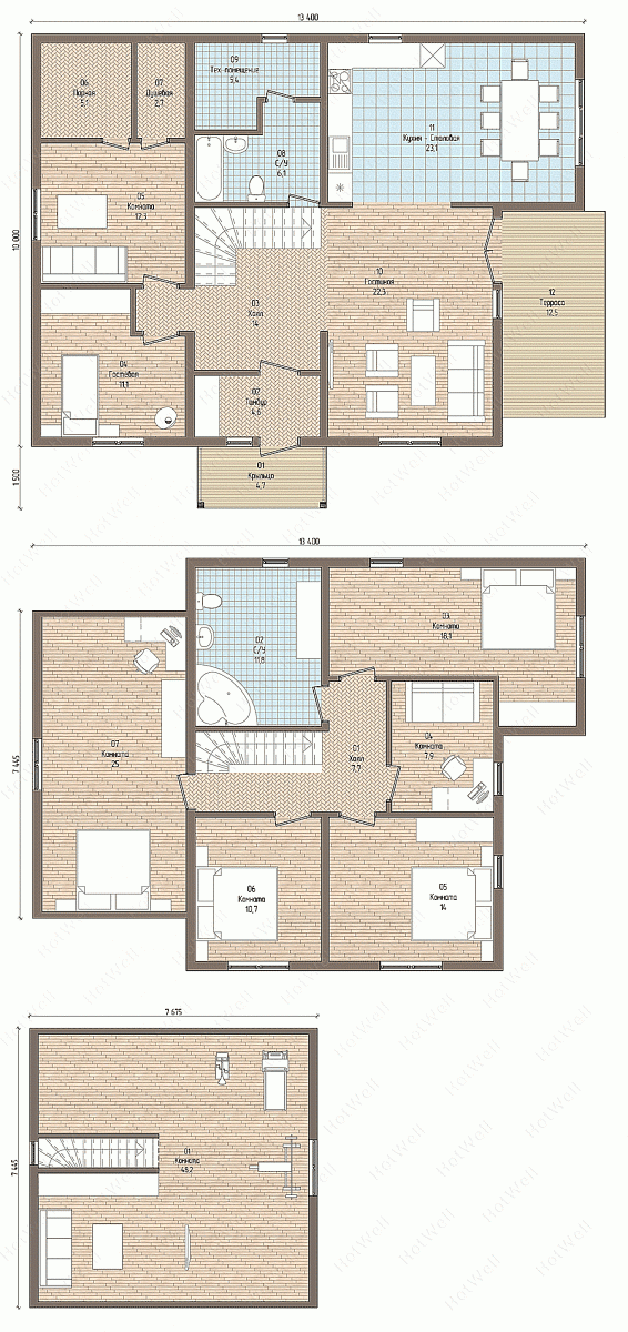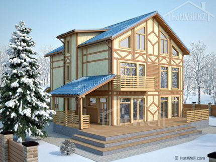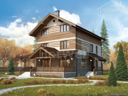 Трехэтажный дом 13 на 12 метров, общей площадью 306 м2, из СИП панелей, с сауной, бойлерной, террасой и спальней на первом этаже.