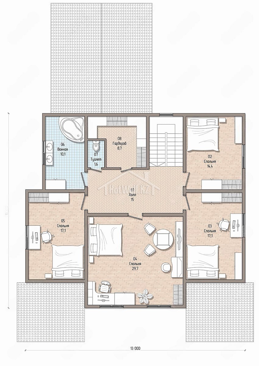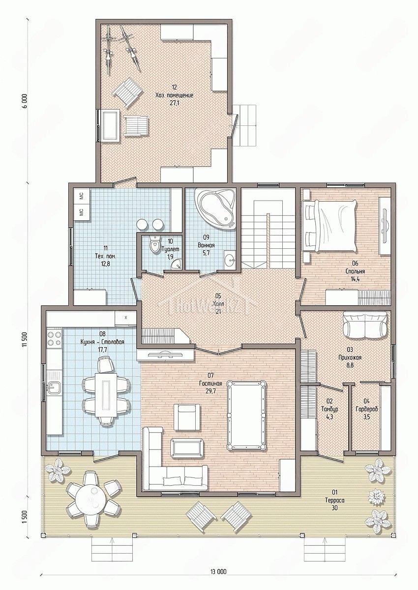 Дом с мансардой 19 на 13 метров, общей площадью 329 м2, из СИП панелей, с бойлерной, террасой и спальней на первом этаже.