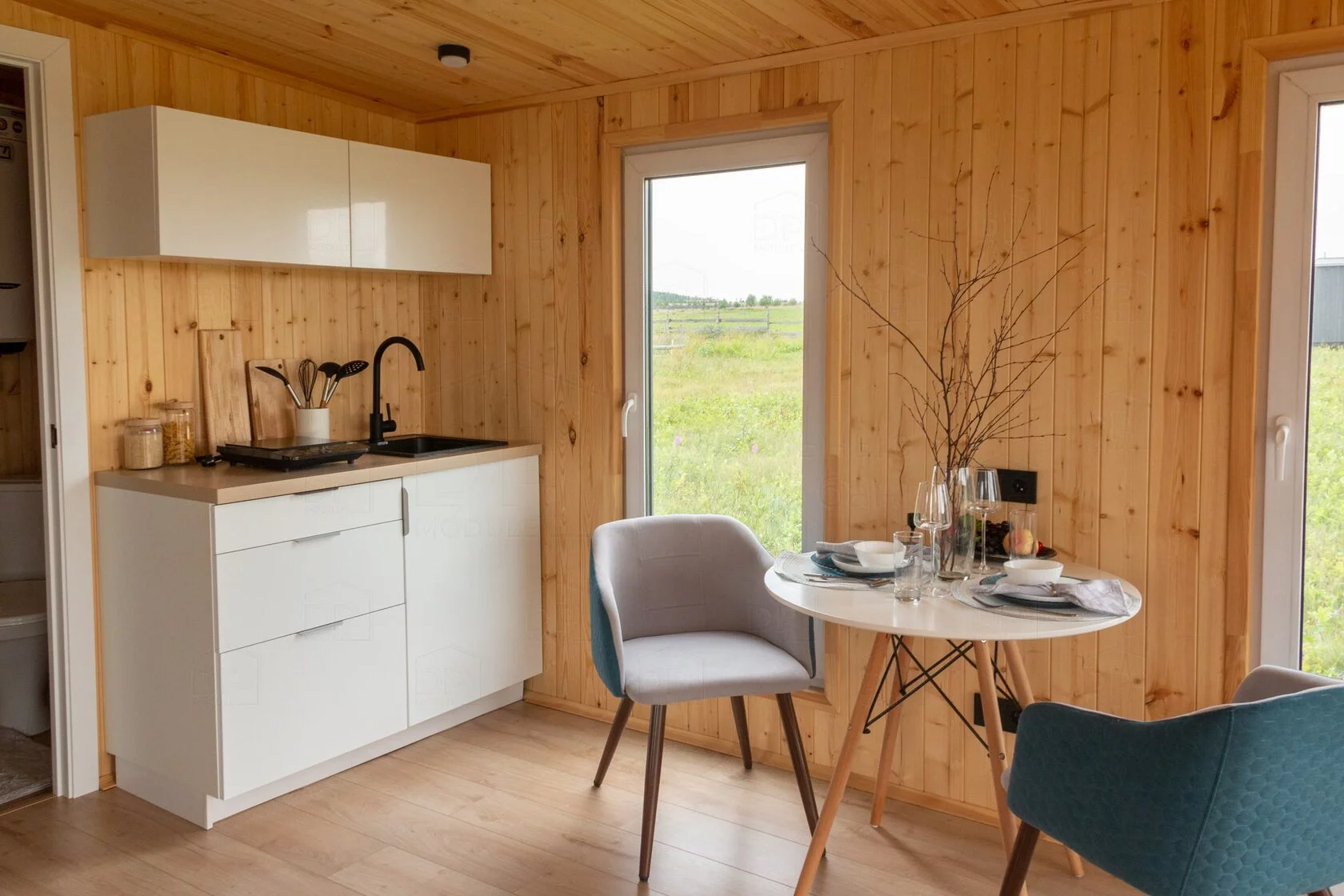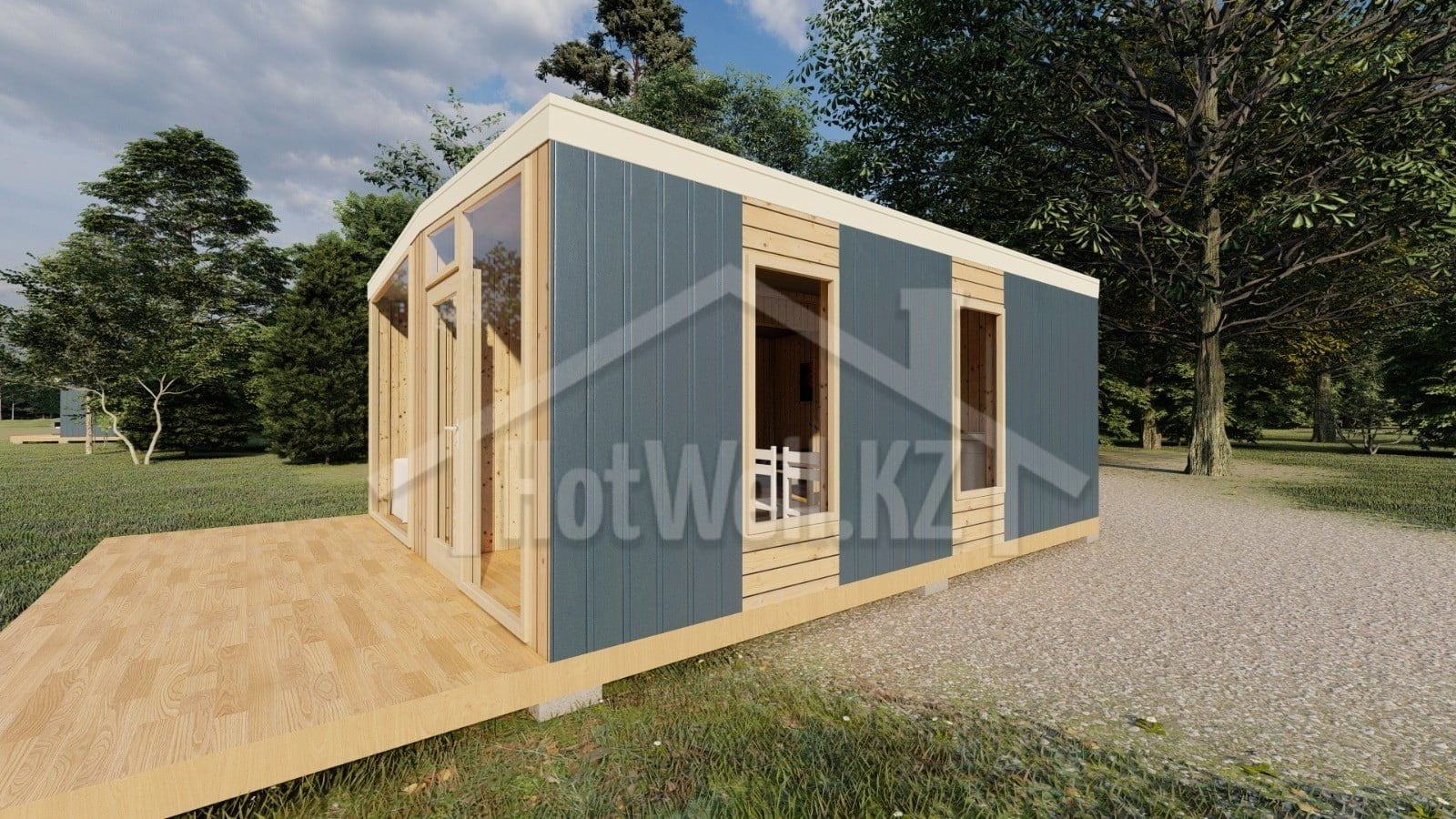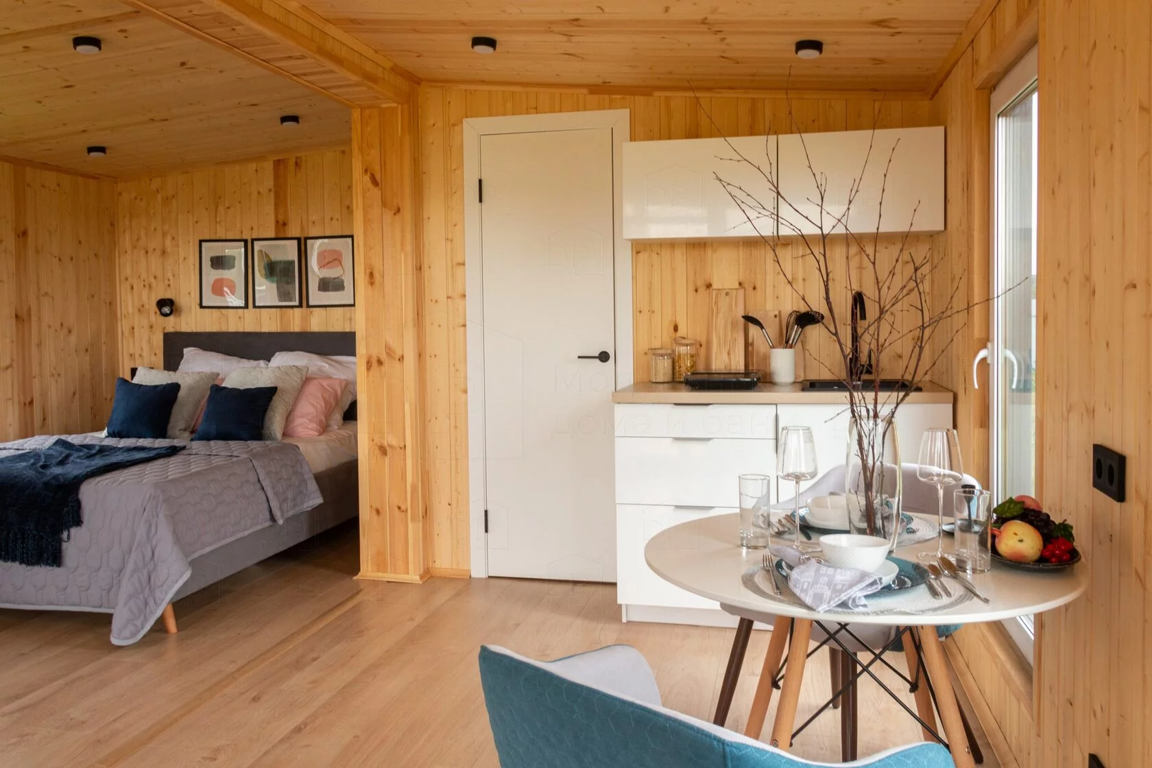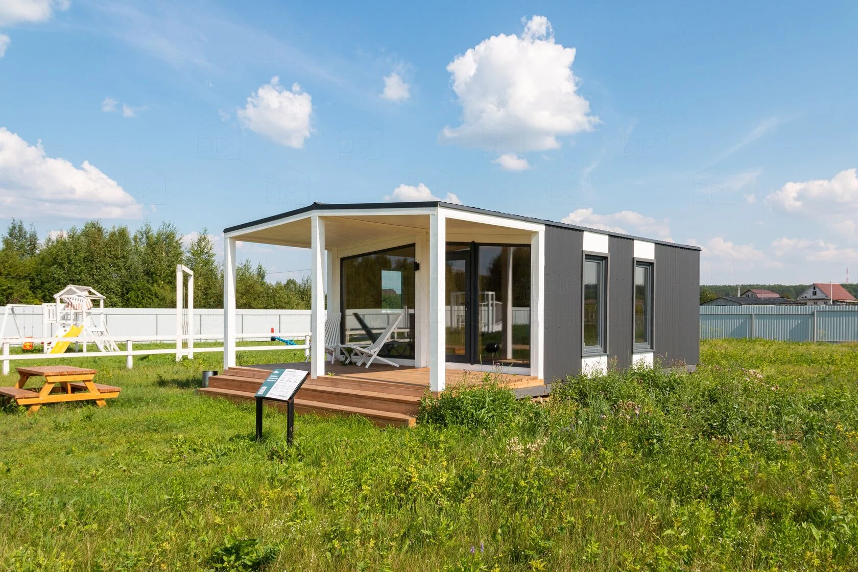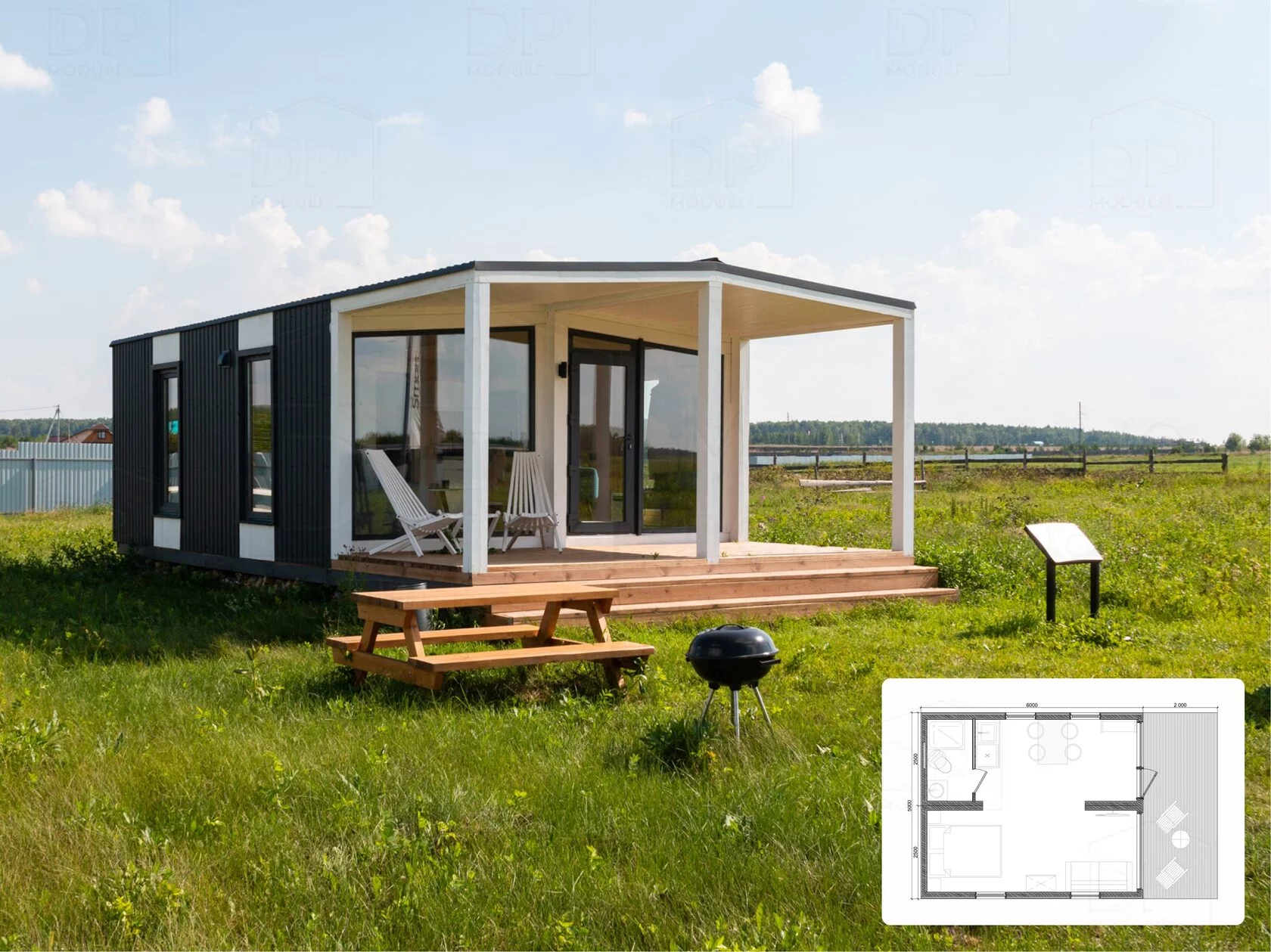 Добро пожаловать в проект модульного дома, который охватывает площадь 40 квадратных метров и состоит из двух модулей, дополненных террасой. Этот дом разработан с учетом максимального комфорта и функциональности для вашей семьи.При входе в дом вы попадаете в просторную гостиную, которая гармонично соединяется с уютной спальней, создавая единое пространство для отдыха и развлечений. Панорамные окна, которыми оборудована гостиная, пропускают много естественного света, а также открывают прекрасные виды на окружающую природу.Кухня-студия в данном проекте является идеальным местом для приготовления пищи и общения. Она просторная и функциональная, идеально сочетается со столовой, создавая удобное пространство для совместных приемов пищи.В доме также имеется санузел, где вы найдете унитаз, душевую кабину и раковину. Это удобное и практичное пространство, обеспечивающее комфорт и удобство в повседневных потребностях.Модульный дом с панорамными окнами предлагает яркий и просторный интерьер, который создает приятную атмосферу и делает ваше проживание комфортным и уютным. Комбинация удобства, стиля и функциональности делает этот дом идеальным местом для вашей семьи.Наша команда стремится создавать дома, которые отражают ваш уникальный стиль и обеспечивают все необходимое для комфортной жизни. Этот модульный дом является идеальным вариантом для семьи, которая ценит простоту и функциональность без ущерба для стиля и комфорта.