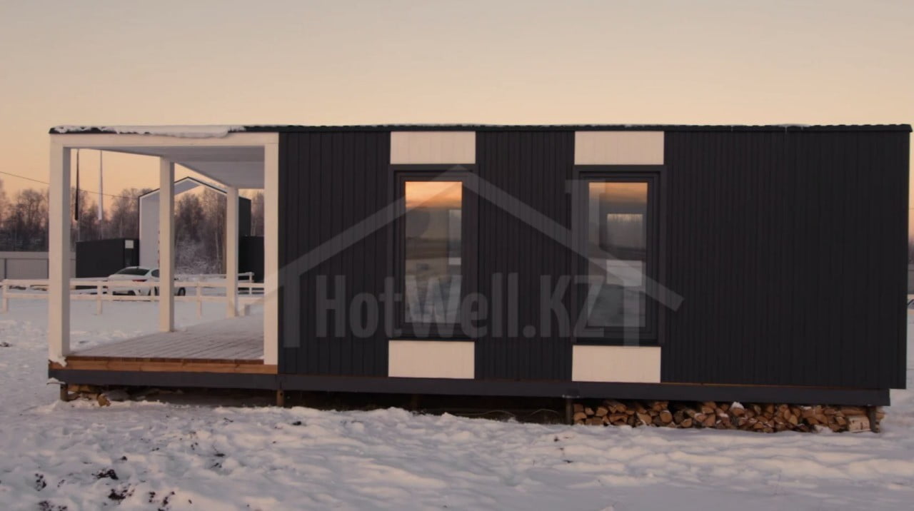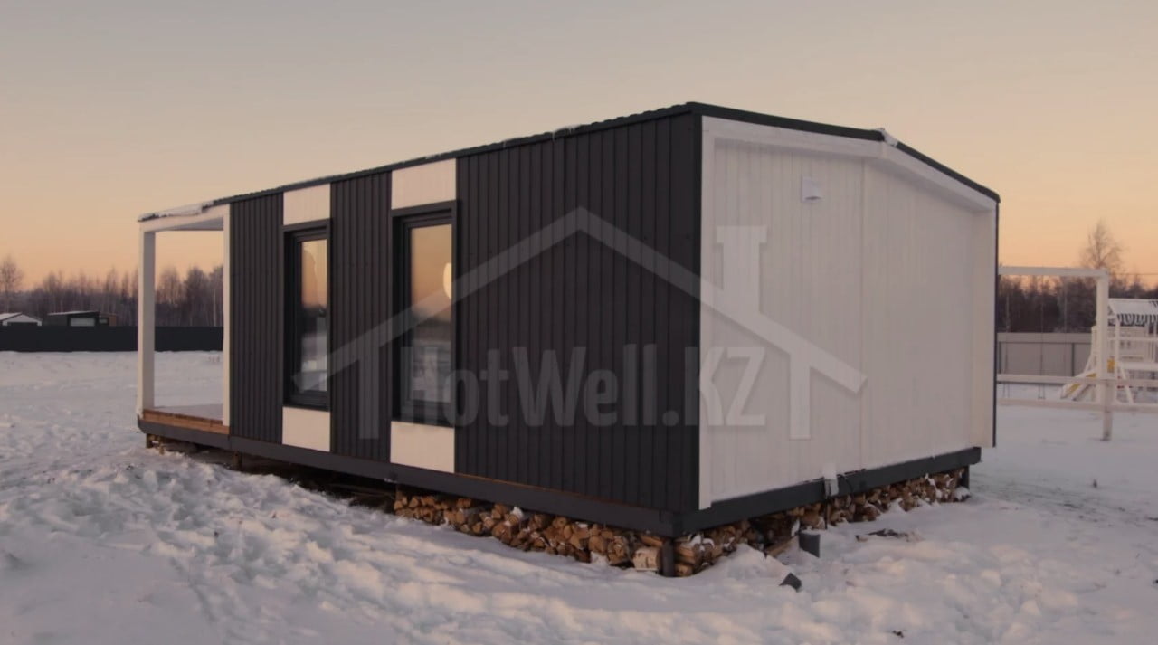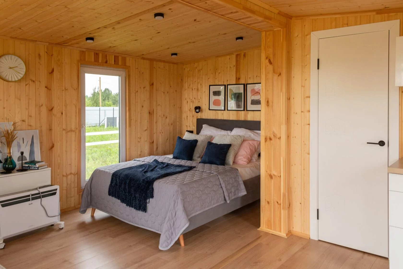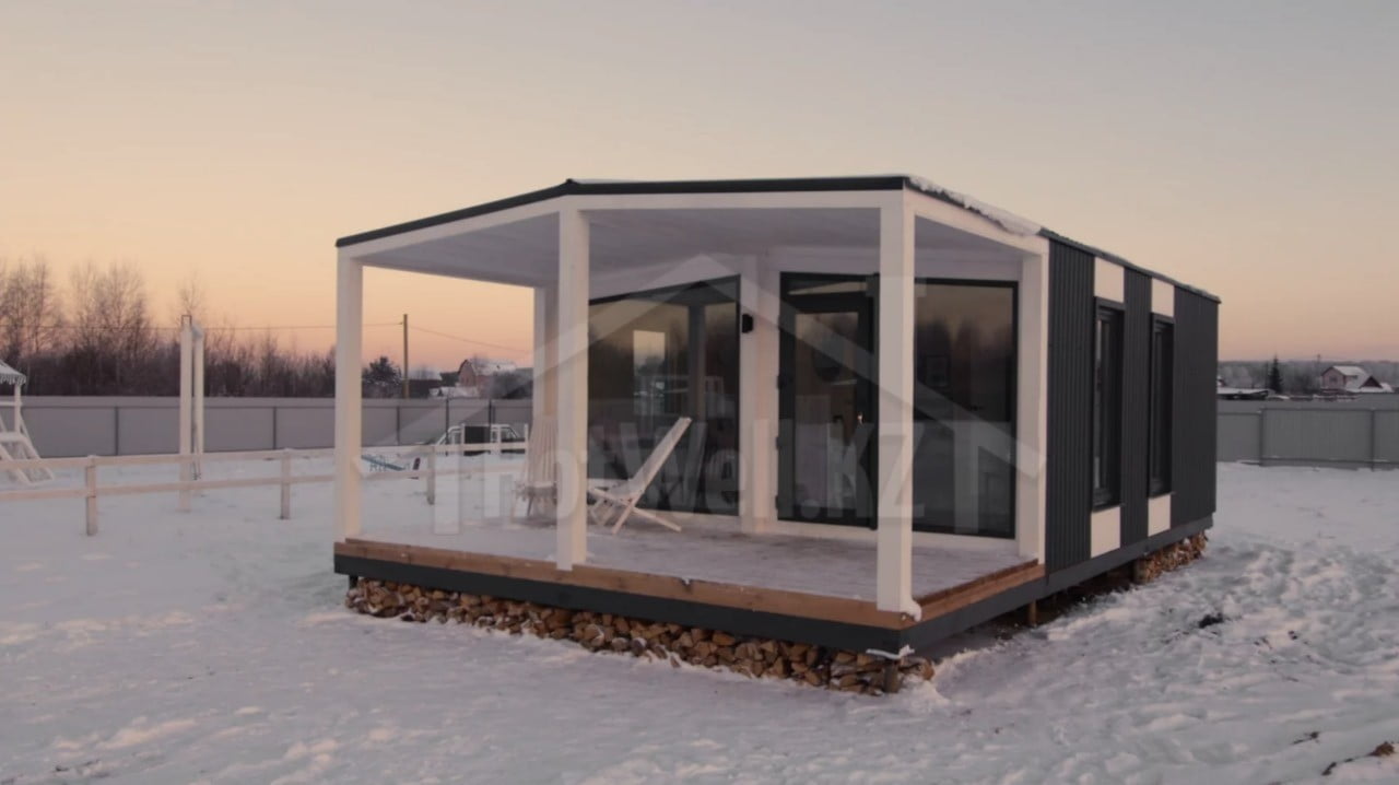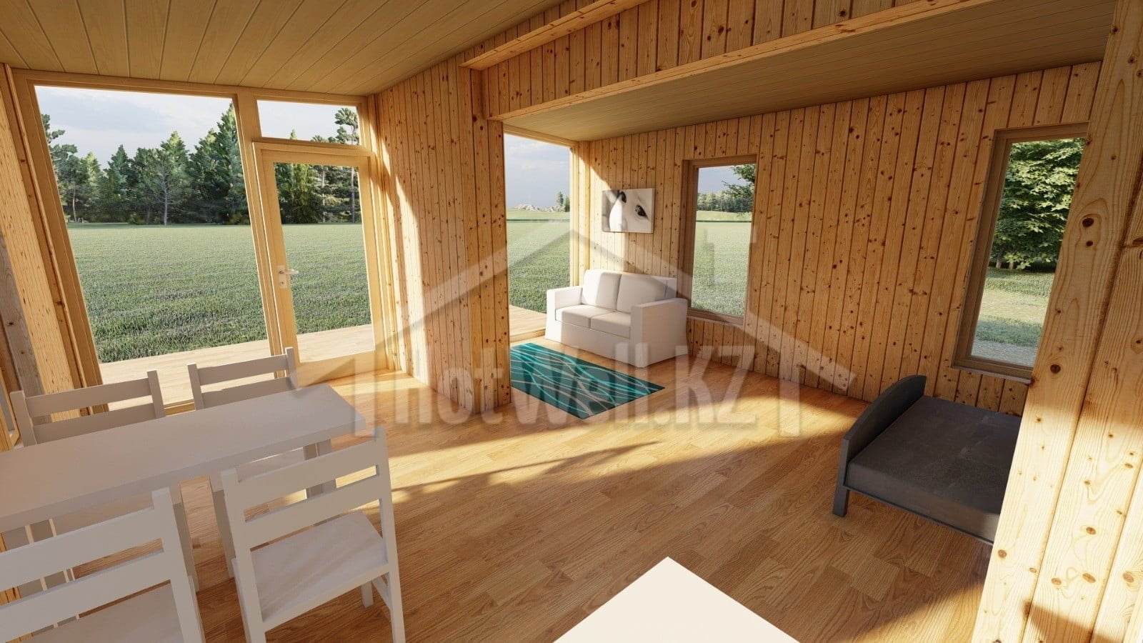 Добро пожаловать в проект модульного дома, который охватывает площадь 40 квадратных метров и состоит из двух модулей, дополненных террасой. Этот дом разработан с учетом максимального комфорта и функциональности для вашей семьи.При входе в дом вы попадаете в просторную гостиную, которая гармонично соединяется с уютной спальней, создавая единое пространство для отдыха и развлечений. Панорамные окна, которыми оборудована гостиная, пропускают много естественного света, а также открывают прекрасные виды на окружающую природу.Кухня-студия в данном проекте является идеальным местом для приготовления пищи и общения. Она просторная и функциональная, идеально сочетается со столовой, создавая удобное пространство для совместных приемов пищи.В доме также имеется санузел, где вы найдете унитаз, душевую кабину и раковину. Это удобное и практичное пространство, обеспечивающее комфорт и удобство в повседневных потребностях.Модульный дом с панорамными окнами предлагает яркий и просторный интерьер, который создает приятную атмосферу и делает ваше проживание комфортным и уютным. Комбинация удобства, стиля и функциональности делает этот дом идеальным местом для вашей семьи.Наша команда стремится создавать дома, которые отражают ваш уникальный стиль и обеспечивают все необходимое для комфортной жизни. Этот модульный дом является идеальным вариантом для семьи, которая ценит простоту и функциональность без ущерба для стиля и комфорта.