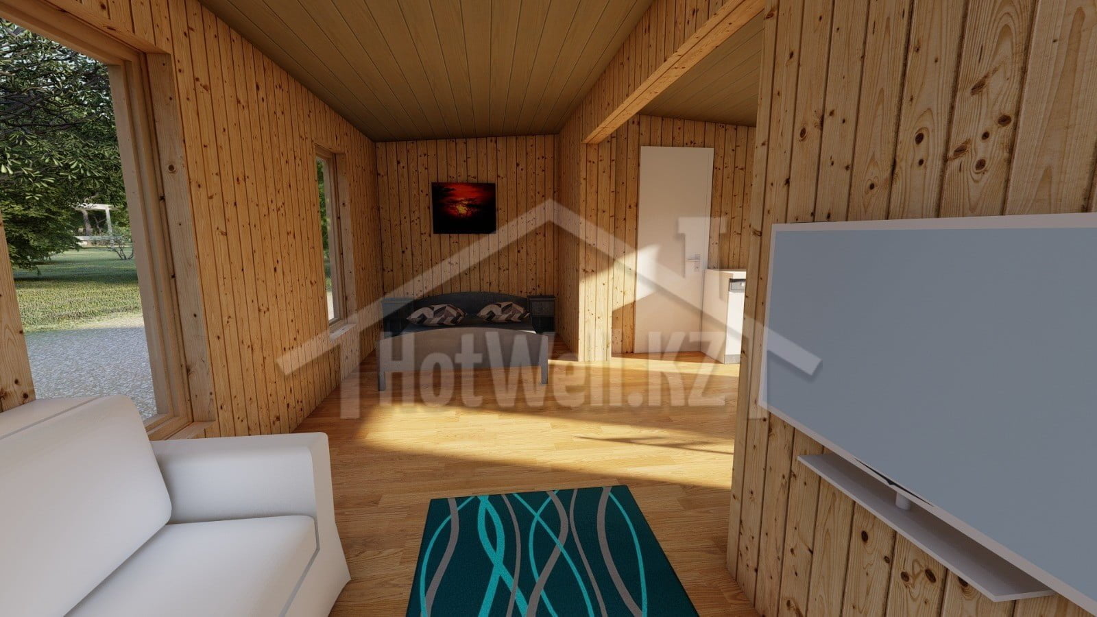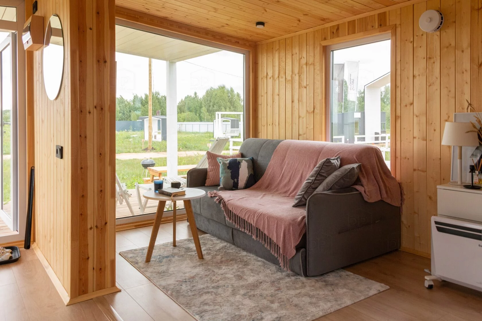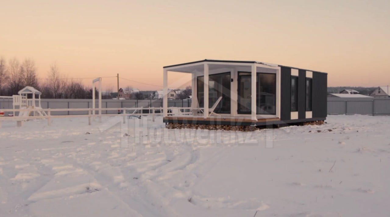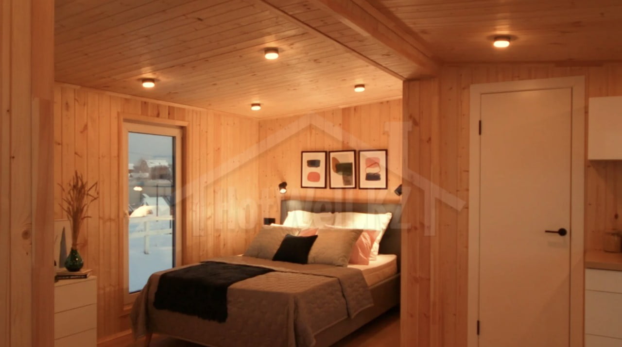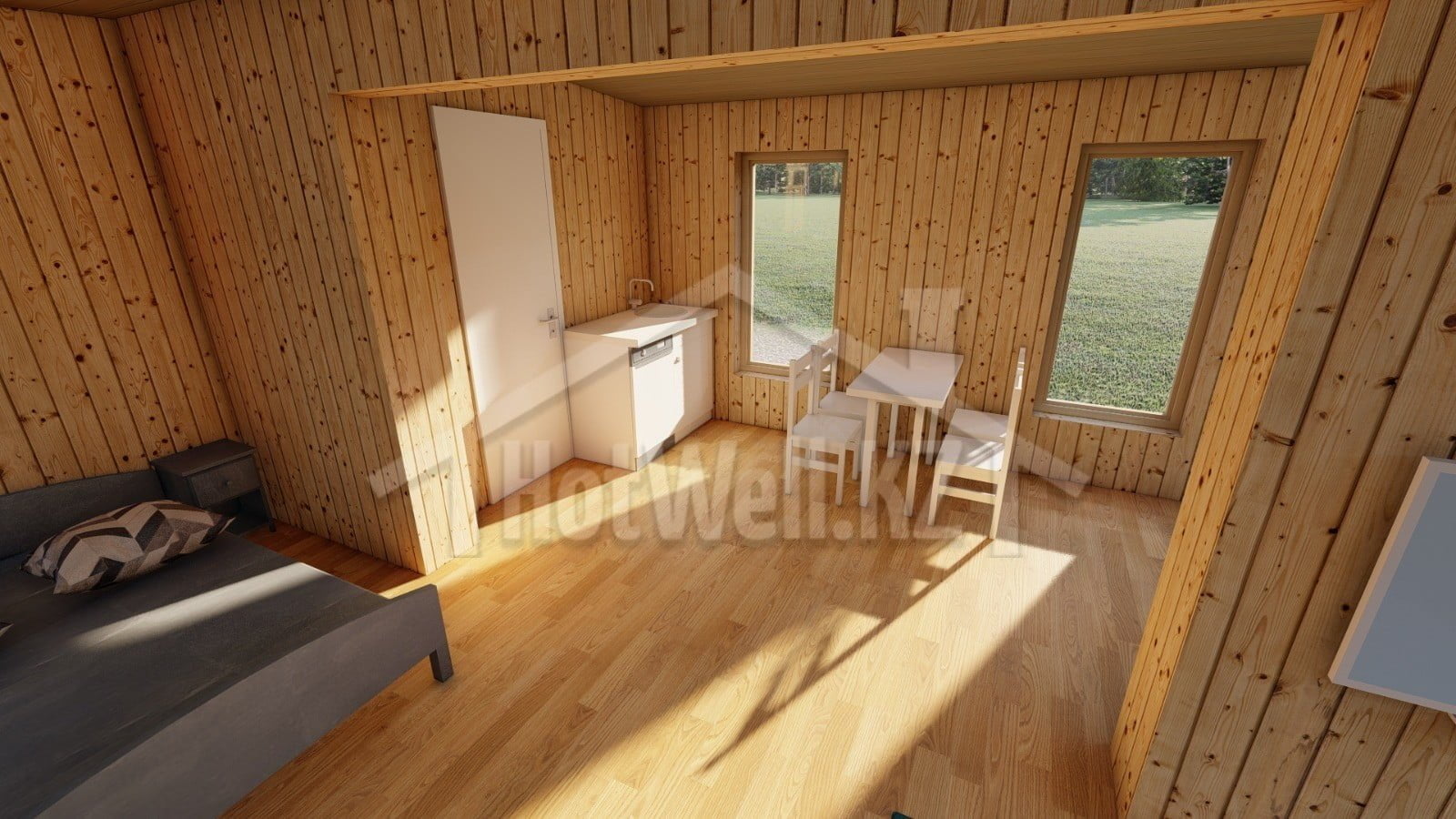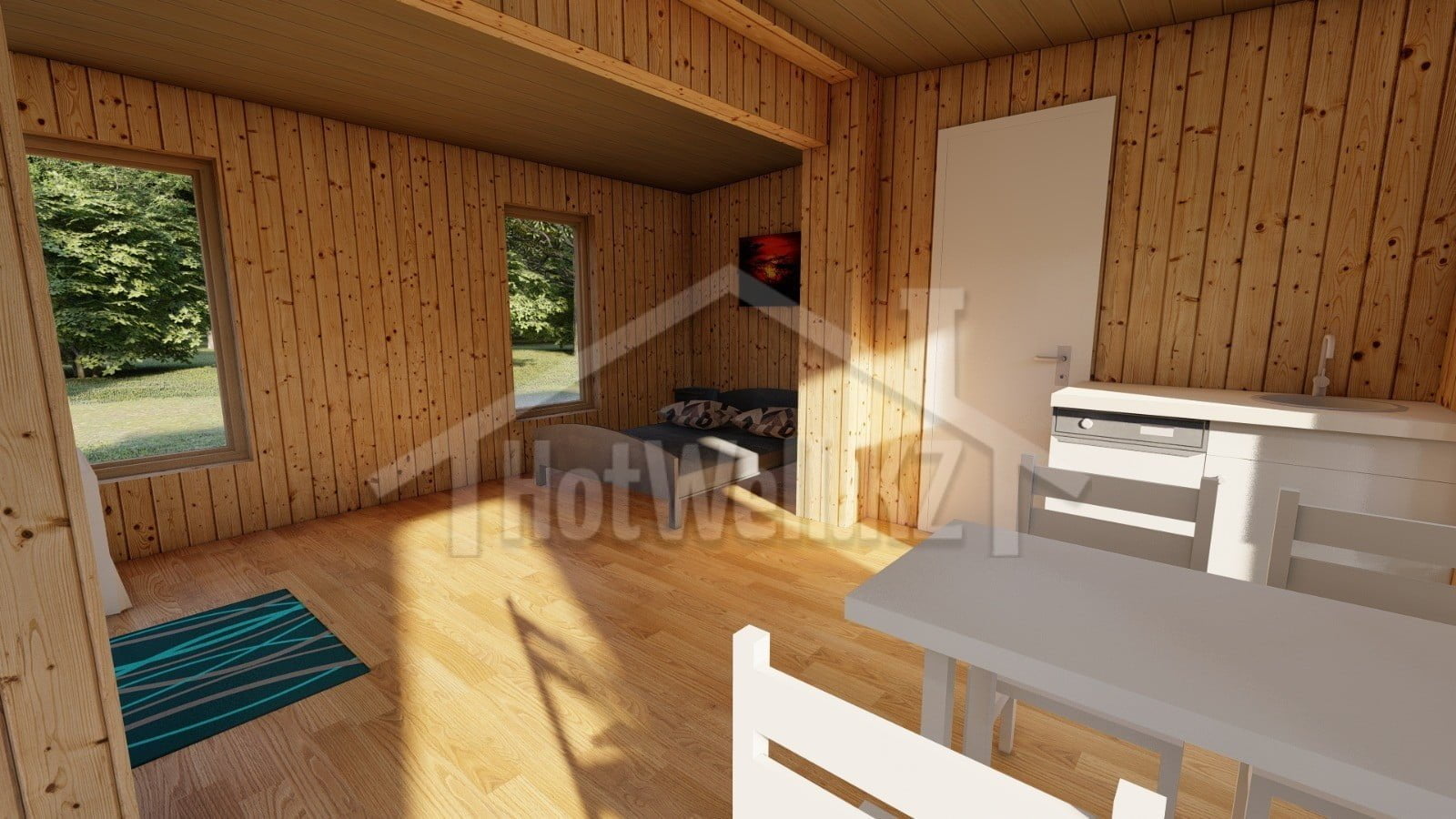 Добро пожаловать в проект модульного дома, который охватывает площадь 40 квадратных метров и состоит из двух модулей, дополненных террасой. Этот дом разработан с учетом максимального комфорта и функциональности для вашей семьи.При входе в дом вы попадаете в просторную гостиную, которая гармонично соединяется с уютной спальней, создавая единое пространство для отдыха и развлечений. Панорамные окна, которыми оборудована гостиная, пропускают много естественного света, а также открывают прекрасные виды на окружающую природу.Кухня-студия в данном проекте является идеальным местом для приготовления пищи и общения. Она просторная и функциональная, идеально сочетается со столовой, создавая удобное пространство для совместных приемов пищи.В доме также имеется санузел, где вы найдете унитаз, душевую кабину и раковину. Это удобное и практичное пространство, обеспечивающее комфорт и удобство в повседневных потребностях.Модульный дом с панорамными окнами предлагает яркий и просторный интерьер, который создает приятную атмосферу и делает ваше проживание комфортным и уютным. Комбинация удобства, стиля и функциональности делает этот дом идеальным местом для вашей семьи.Наша команда стремится создавать дома, которые отражают ваш уникальный стиль и обеспечивают все необходимое для комфортной жизни. Этот модульный дом является идеальным вариантом для семьи, которая ценит простоту и функциональность без ущерба для стиля и комфорта.