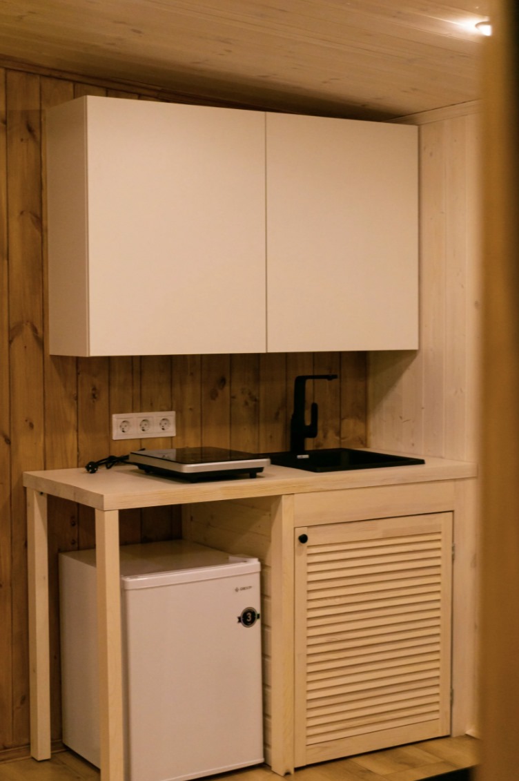 Стены: имитация бруса сорт — АБ, потолок: вагонка штиль АБ или натяжной матовый потолок на выбор.