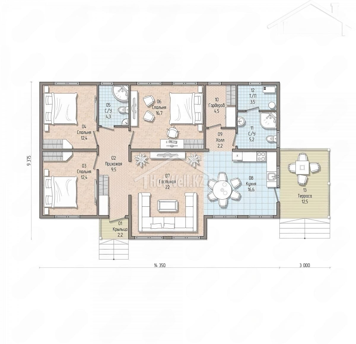Одноэтажный дом 17 на 9 метров, общей площадью 137 м2, из СИП панелей, с бойлерной, террасой и спальней на первом этаже.