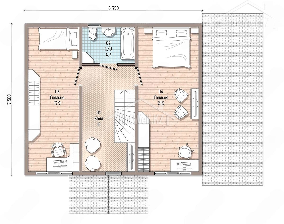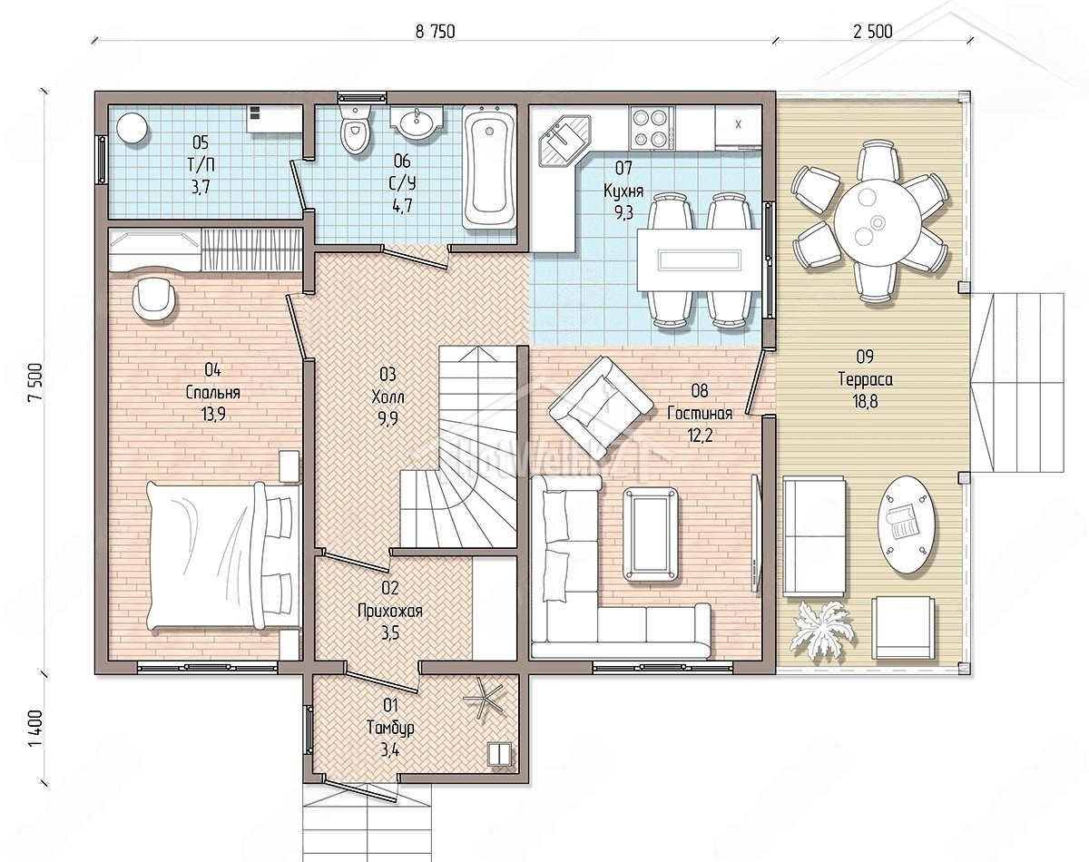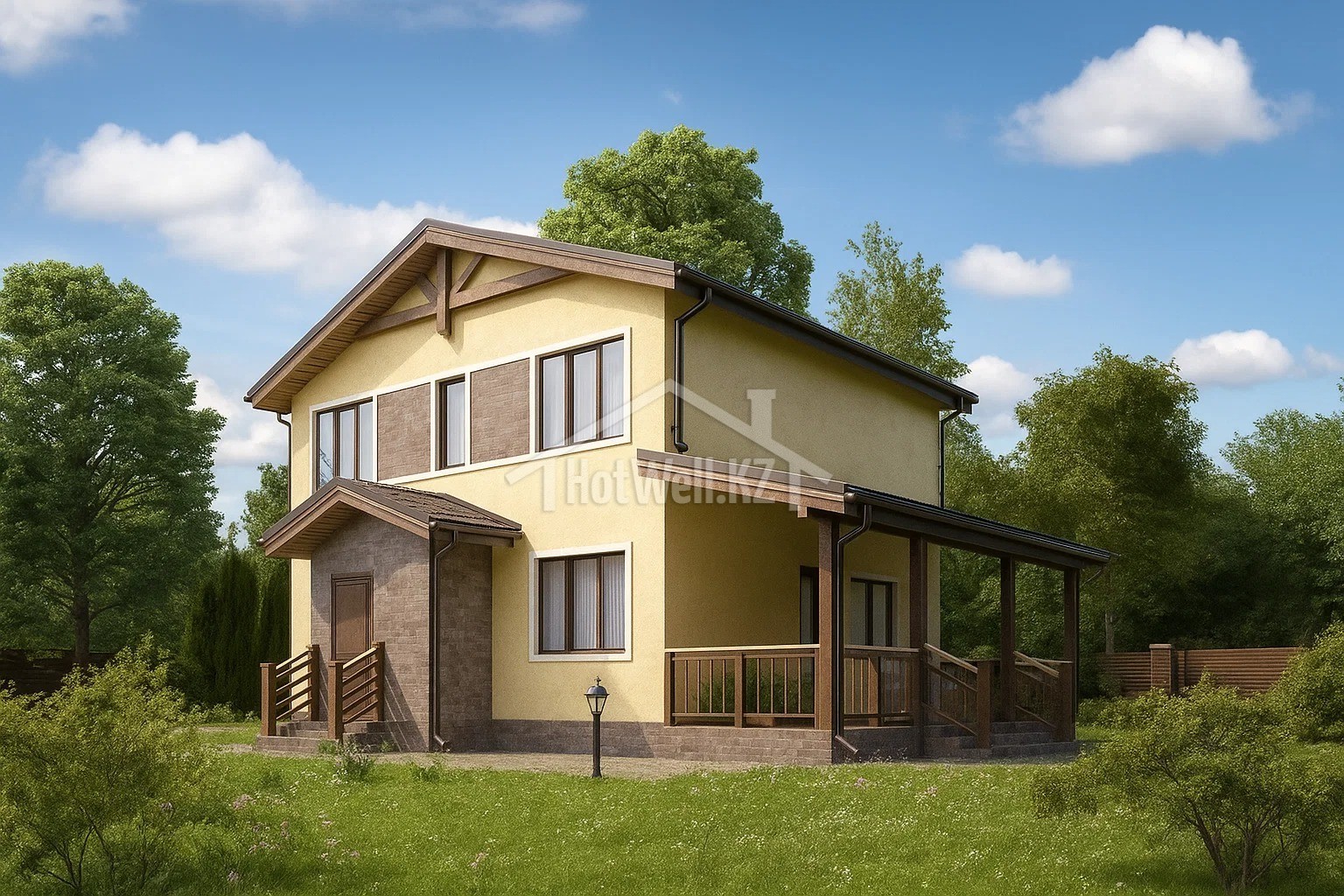 Двухэтажный дом 11 на 9 метров, общей площадью 154 м2, из СИП панелей, с бойлерной, террасой и спальней на первом этаже.