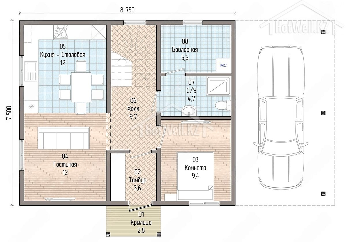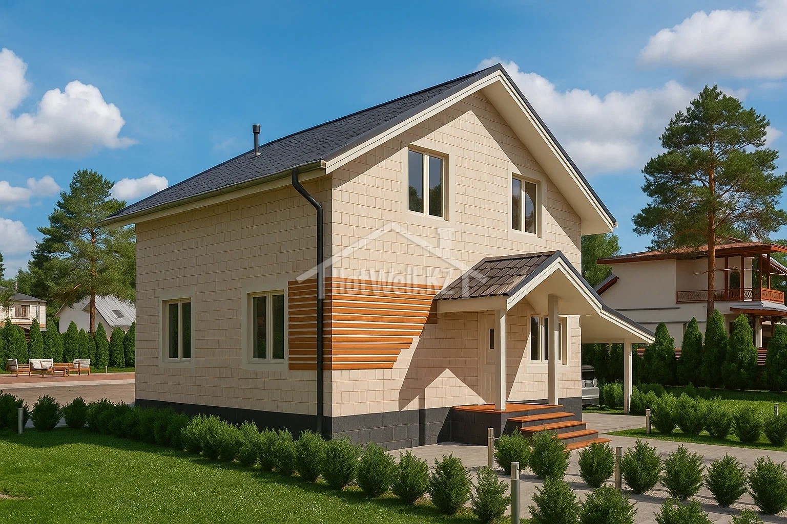 Дом с мансардой 12 на 8 метров, общей площадью 158 м2, из СИП панелей, с бойлерной, навесом и спальней на первом этаже.