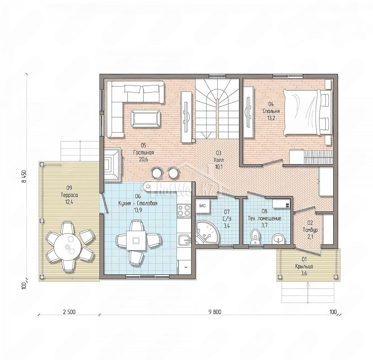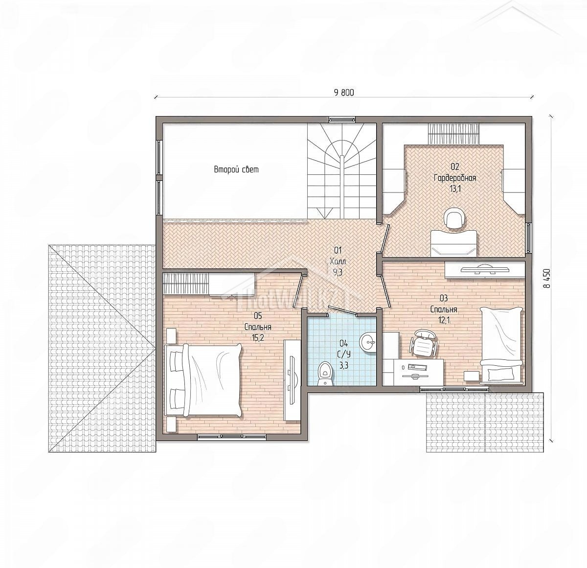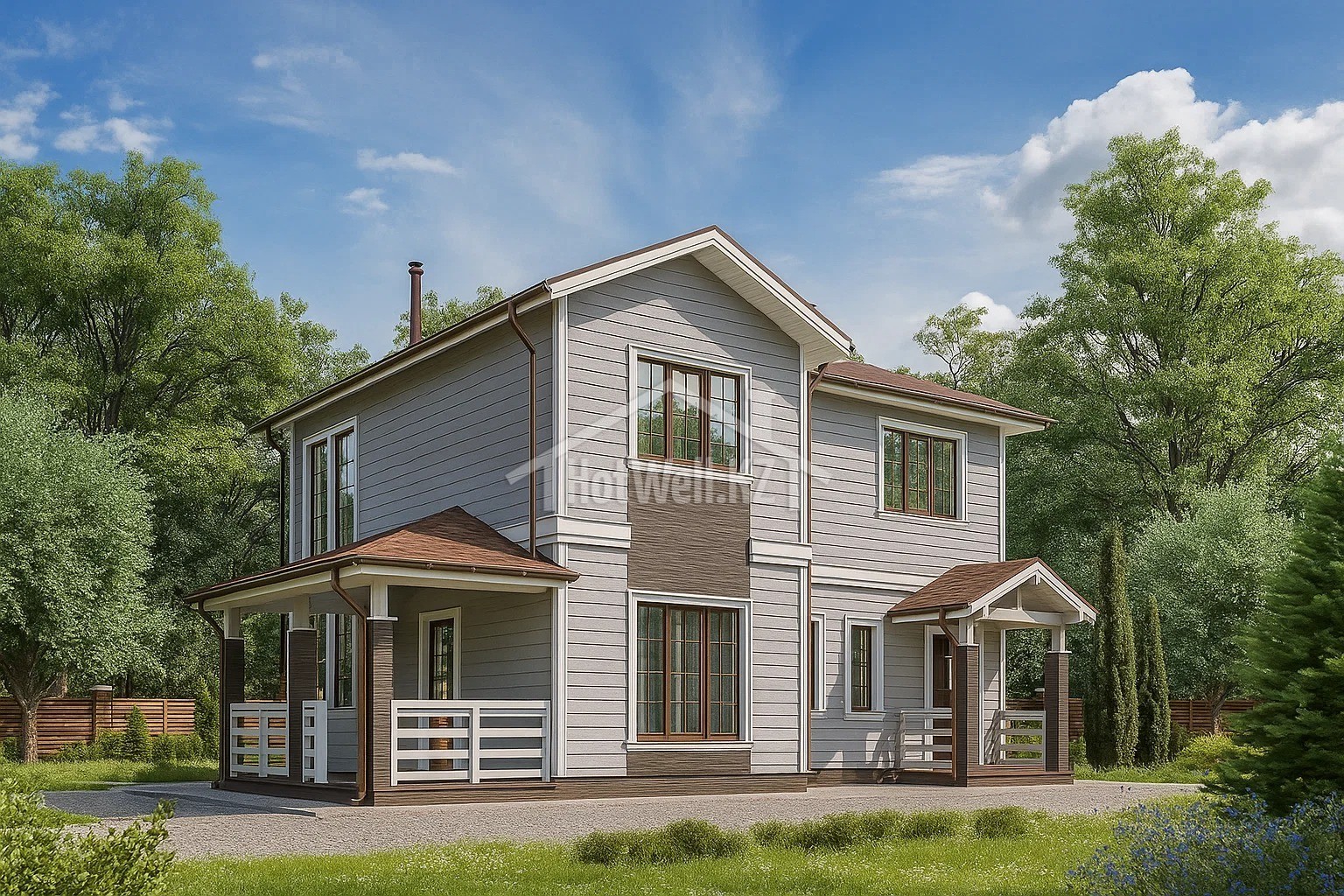 Двухэтажный дом 12 на 9 метров, общей площадью 167 м2, из СИП панелей, с бойлерной, террасой, вторым светом и спальней на первом этаже.