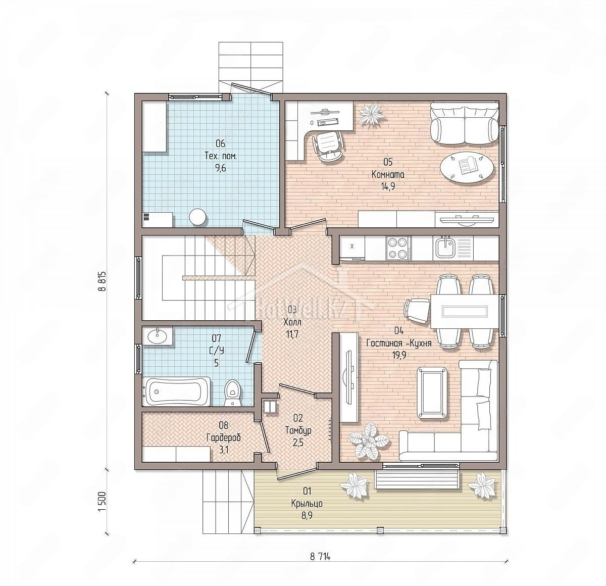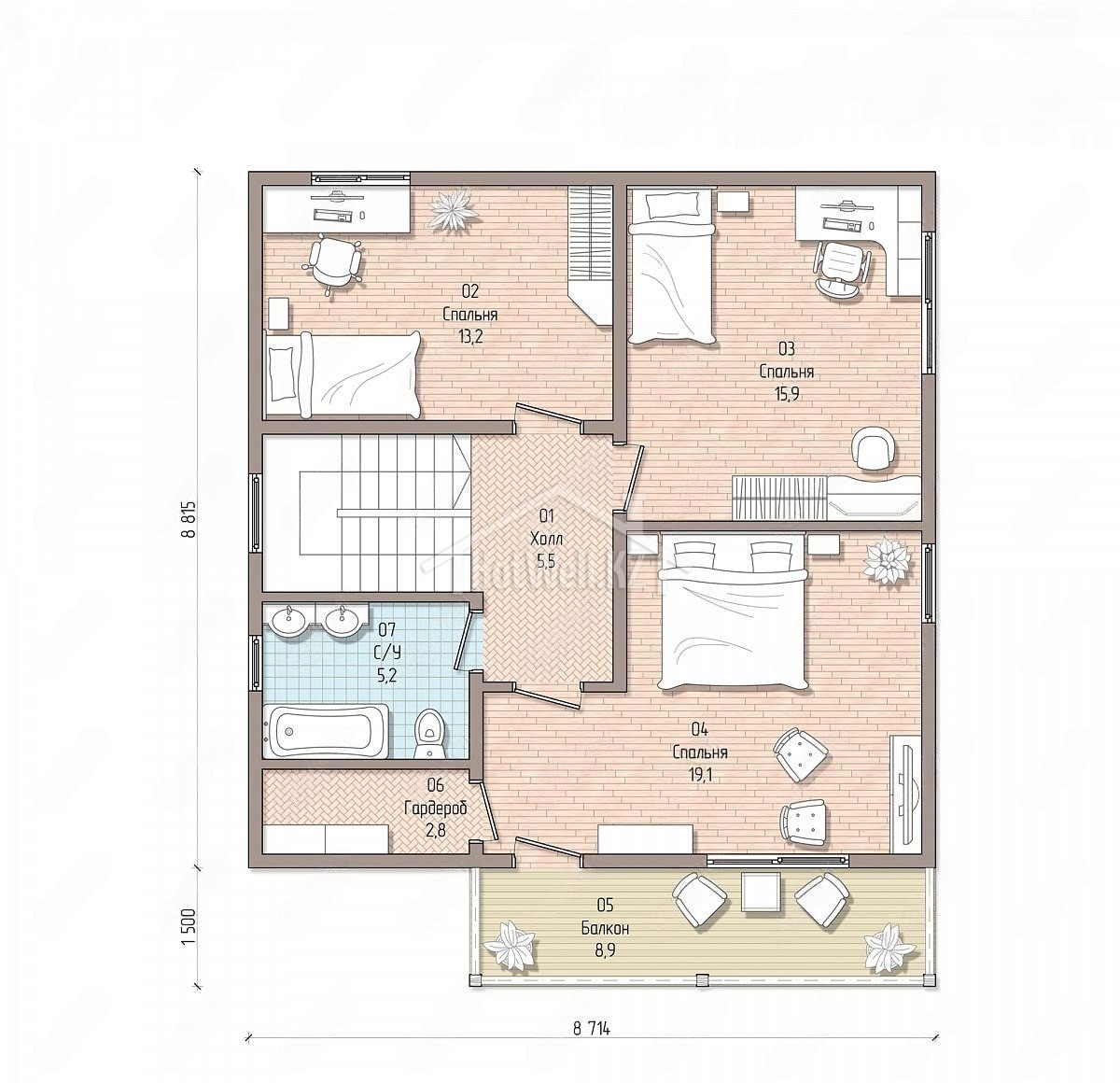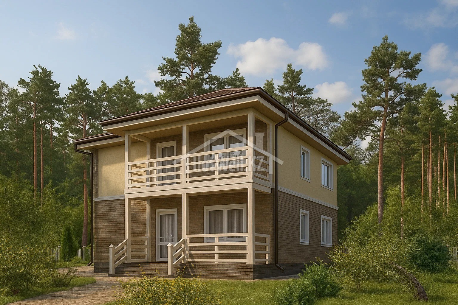 Двухэтажный дом 10 на 9 метров, общей площадью 171 м2, из СИП панелей, с бойлерной, балконом и спальней на первом этаже.