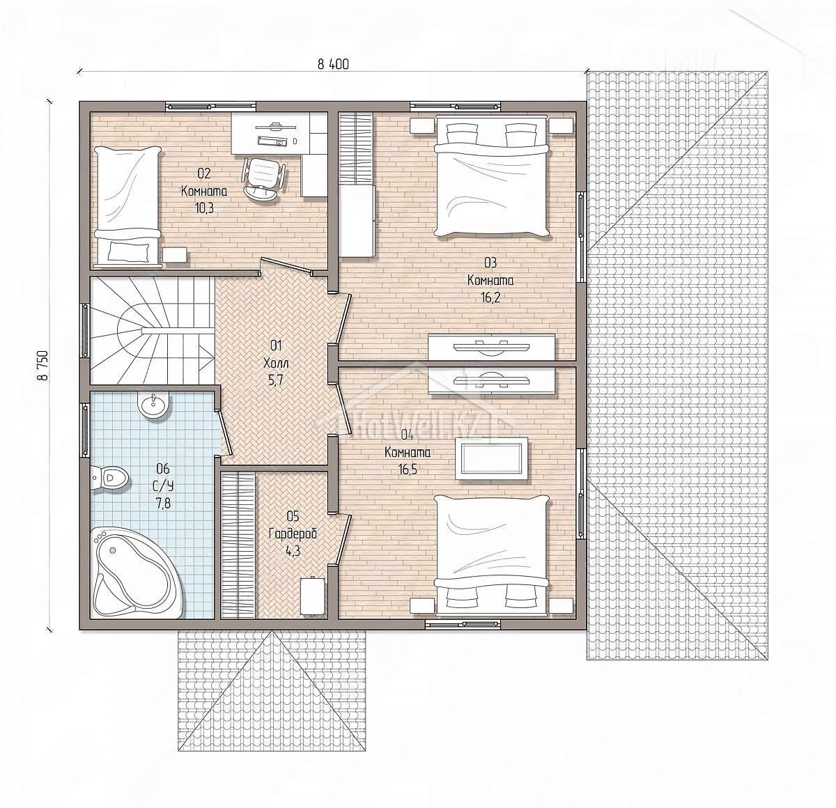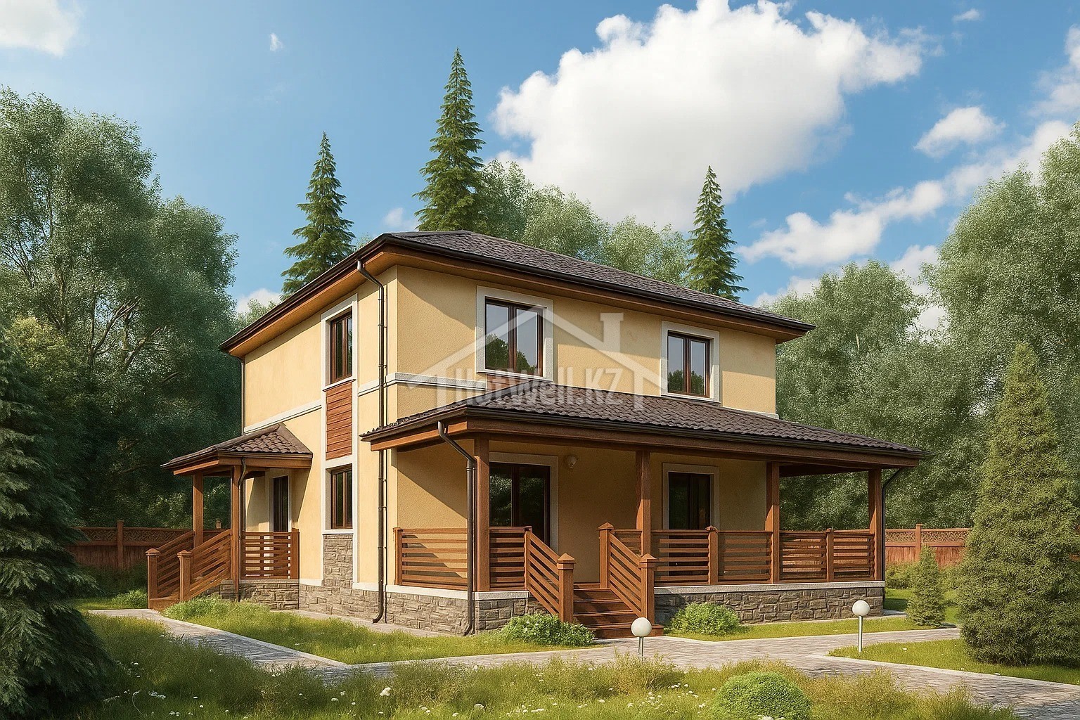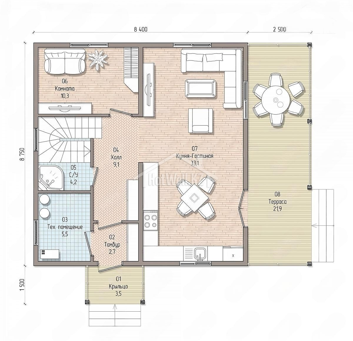 Двухэтажный дом 11 на 10 метров, общей площадью 172 м2, из СИП панелей, с бойлерной, террасой и спальней на первом этаже.