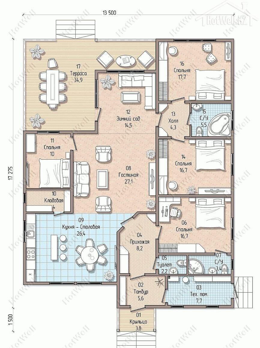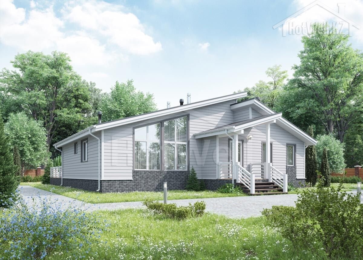 Одноэтажный дом 19 на 14 метров, общей площадью 228 м2, из СИП панелей, с бойлерной, террасой и спальней на первом этаже.