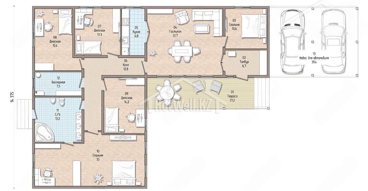 Одноэтажный дом 26 на 14 метров, общей площадью 245 м2, из СИП панелей, с бойлерной, навесом, террасой и спальней на первом этаже.