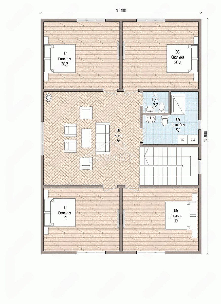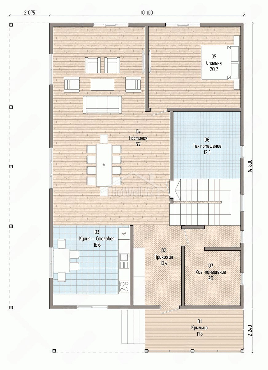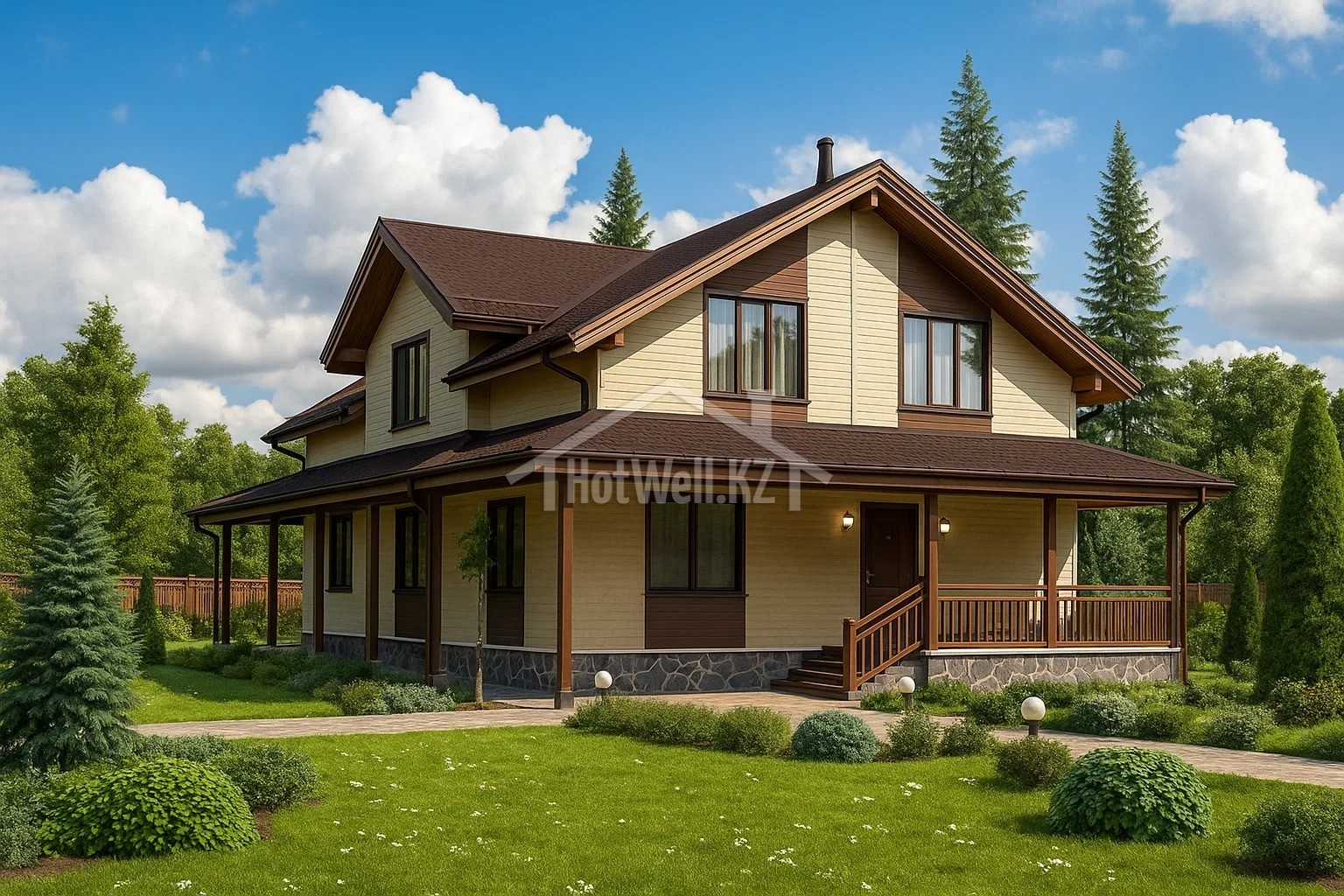 Дом с мансардой 17 на 12 метров, общей площадью 354 м2, из СИП панелей, с бойлерной, террасой и спальней на первом этаже.
