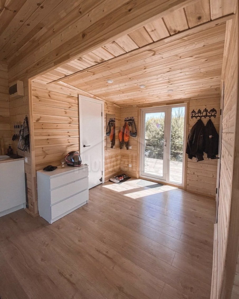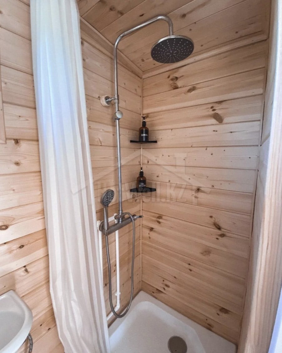 Стены: имитация бруса сорт — АБ, потолок: вагонка штиль АБ или натяжной матовый потолок на выбор.