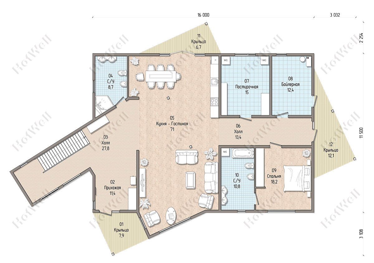 Двухэтажный дом 25 на 15 метров, общей площадью 468 м2, из СИП панелей, с бойлерной и спальней на первом этаже.