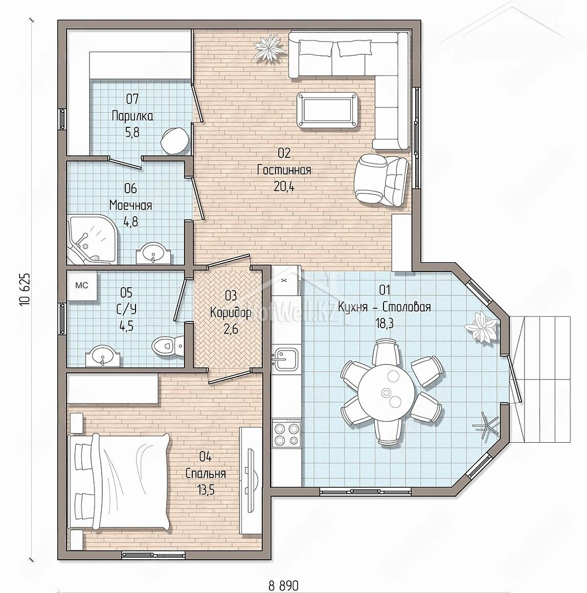 Одноэтажный дом 11 на 9 метров, общей площадью 79 м2, из СИП панелей, с сауной, эркером и спальней на первом этаже.