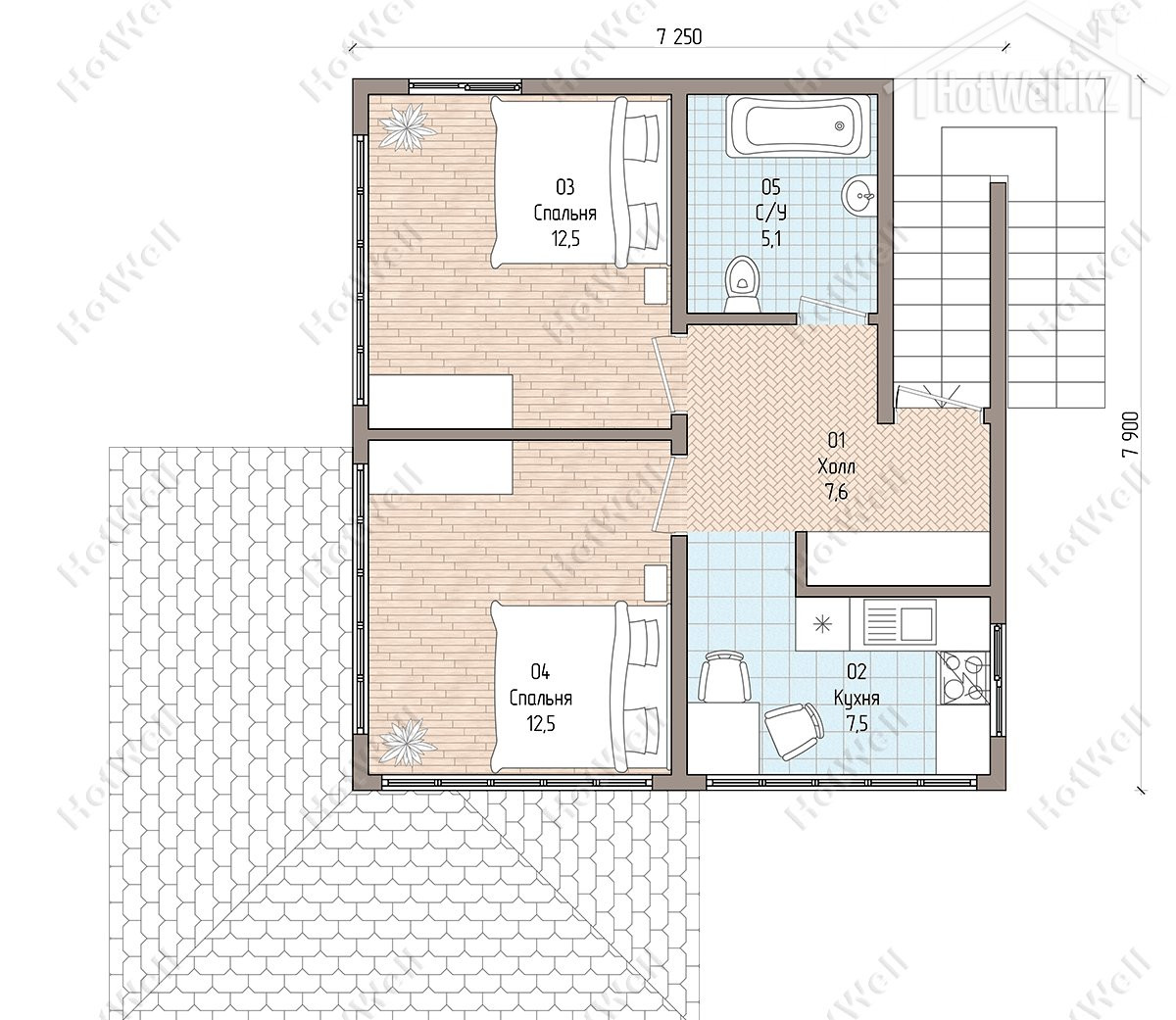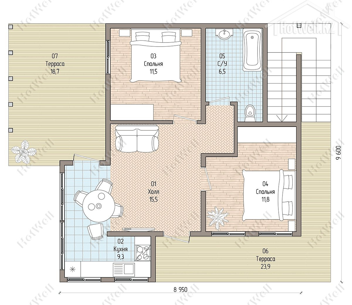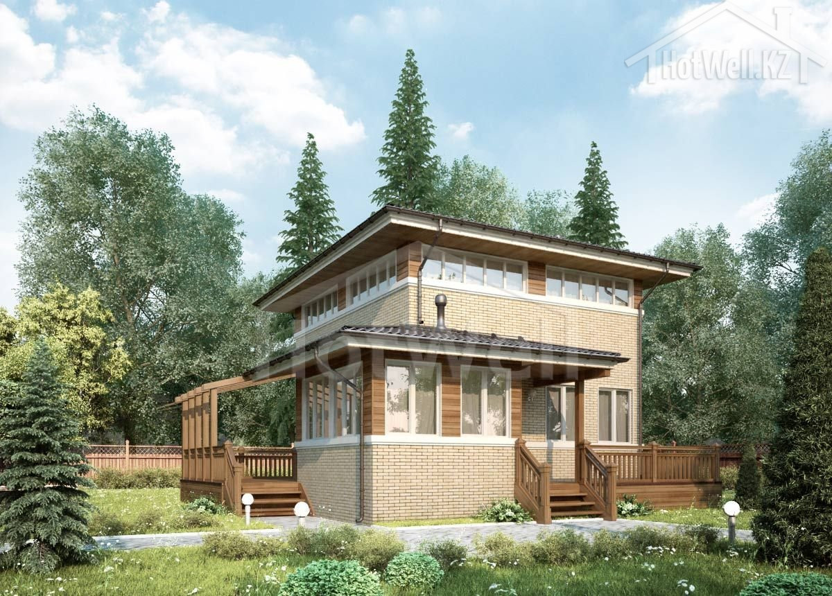 Двухэтажный дом 12 на 10 метров, общей площадью 164 м2, из СИП панелей, с террасой и спальней на первом этаже.