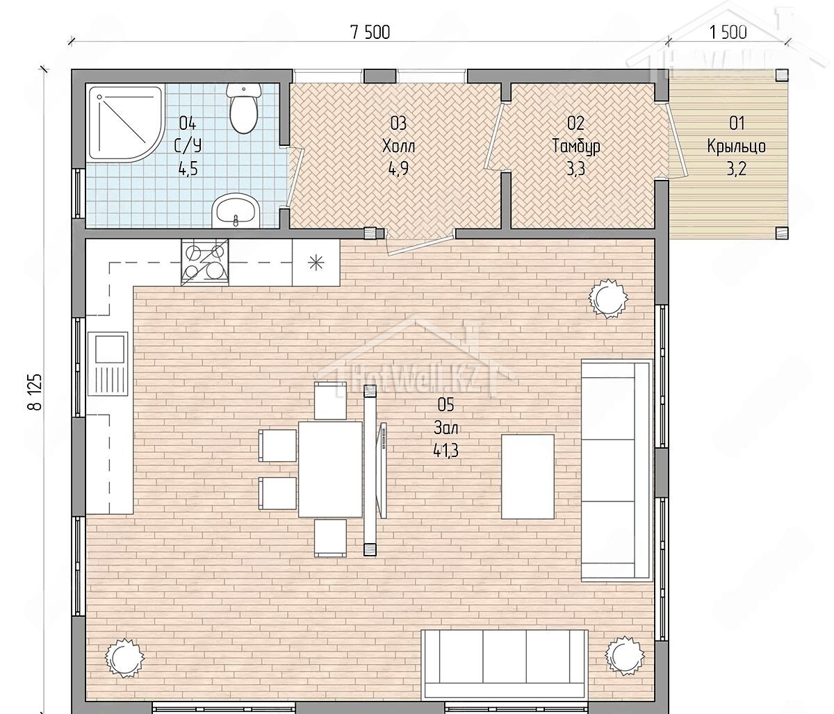 Одноэтажный дом 9 на 8 метров, общей площадью 64 м2, из СИП панелей, со спальней на первом этаже.