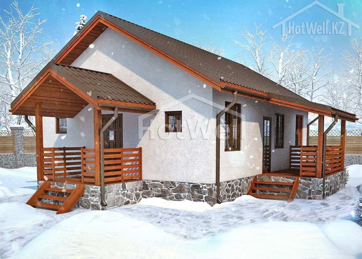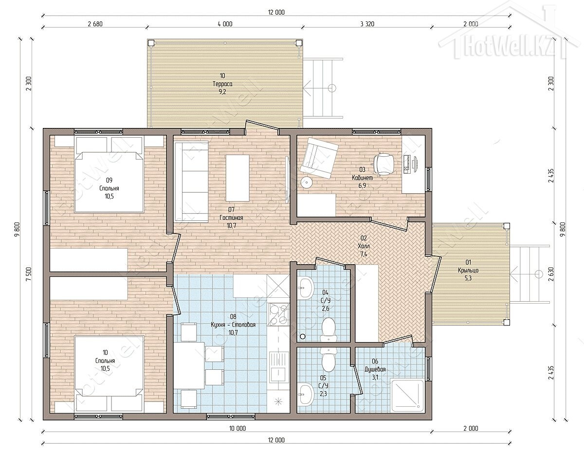 Одноэтажный дом 12 на 10 метров, общей площадью 90 м2, из СИП панелей, с сауной, террасой и спальней на первом этаже.