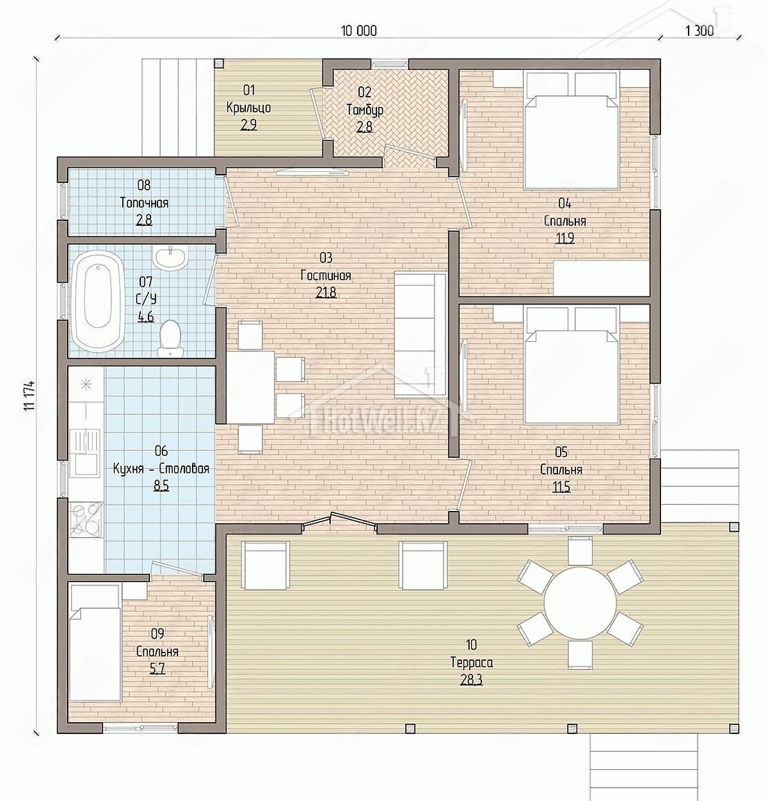 Одноэтажный дом 11 на 11 метров, общей площадью 116 м2, из СИП панелей, с бойлерной, террасой и спальней на первом этаже.