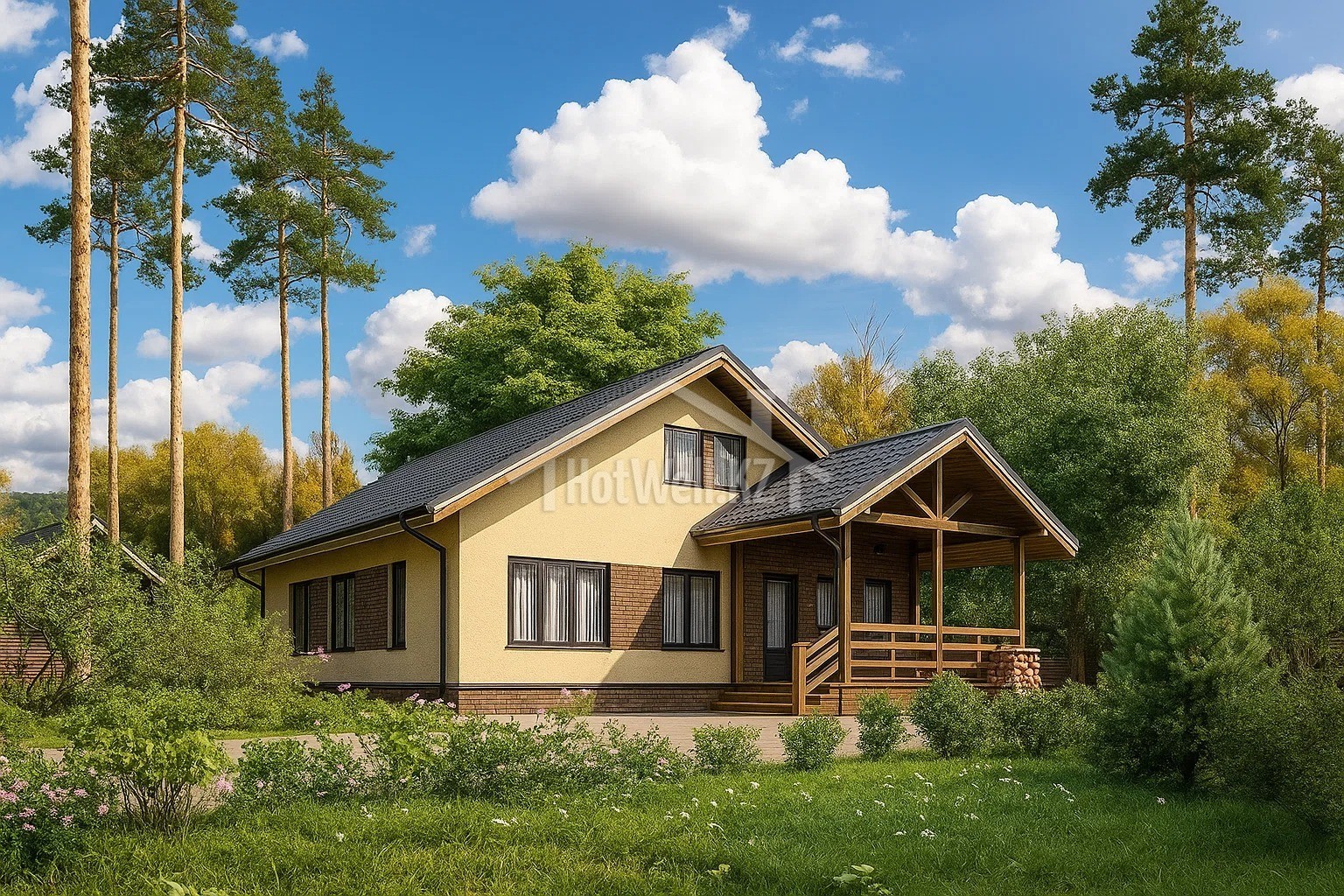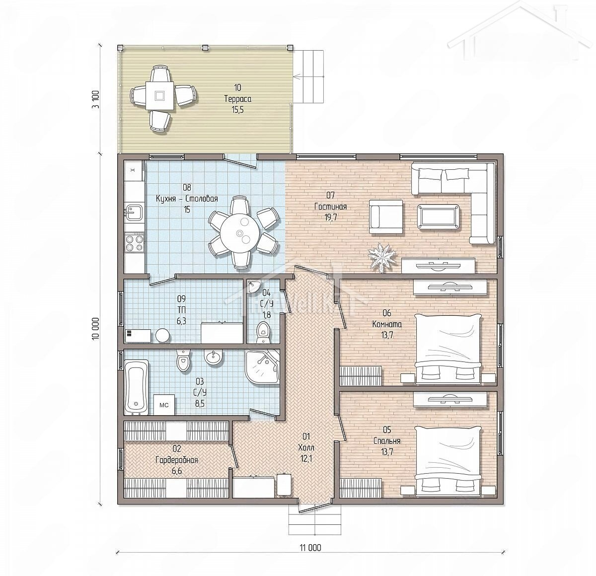 Одноэтажный дом 13 на 11 метров, общей площадью 126 м2, из СИП панелей, с бойлерной, террасой и спальней на первом этаже.