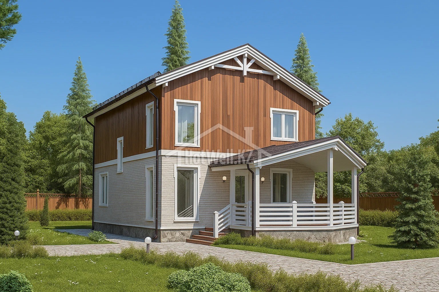 Двухэтажный дом 14 на 8 метров, общей площадью 155 м2, из СИП панелей, с бойлерной, террасой и спальней на первом этаже.