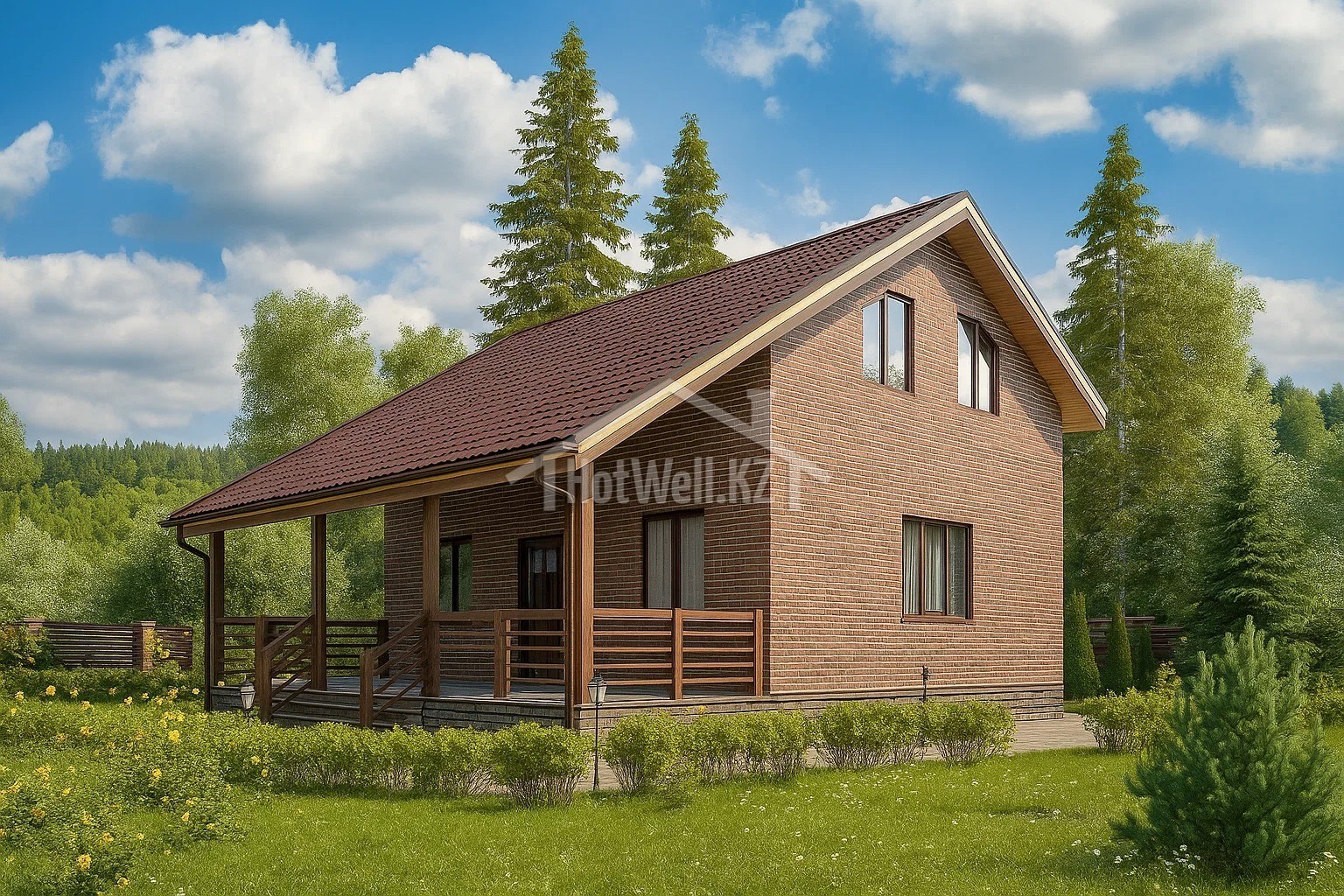 Дом с мансардой 11 на 9 метров, общей площадью 158 м2, из СИП панелей, с бойлерной, террасой и спальней на первом этаже.