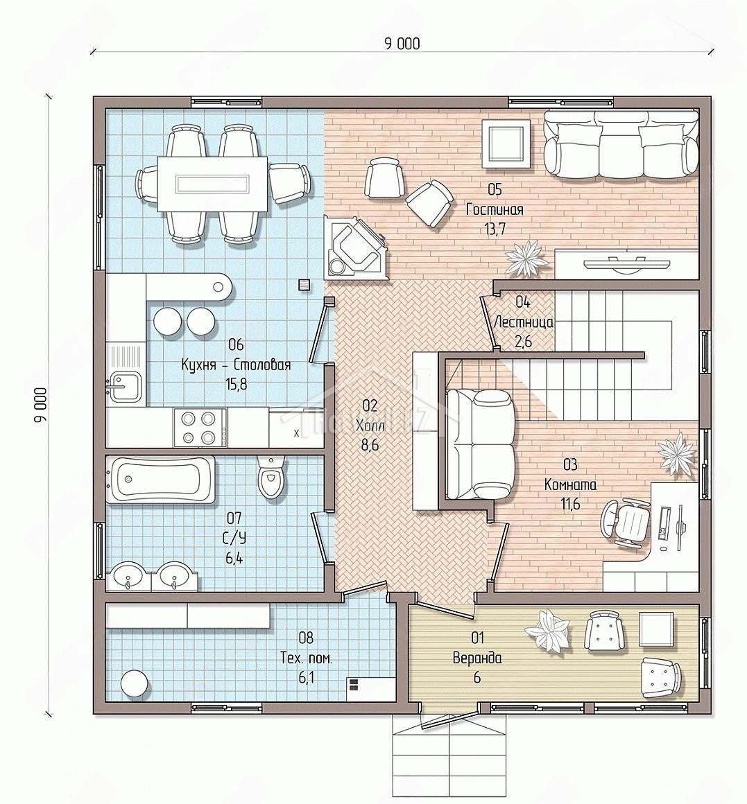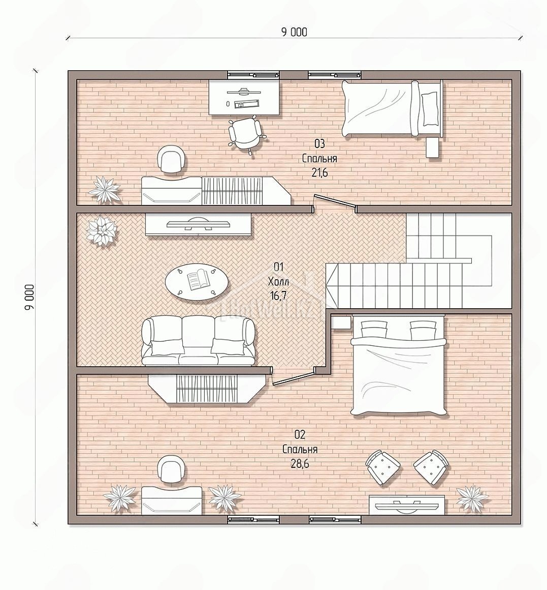 Дом с мансардой 9 на 9 метров, общей площадью 162 м2, из СИП панелей, с бойлерной, террасой и спальней на первом этаже.