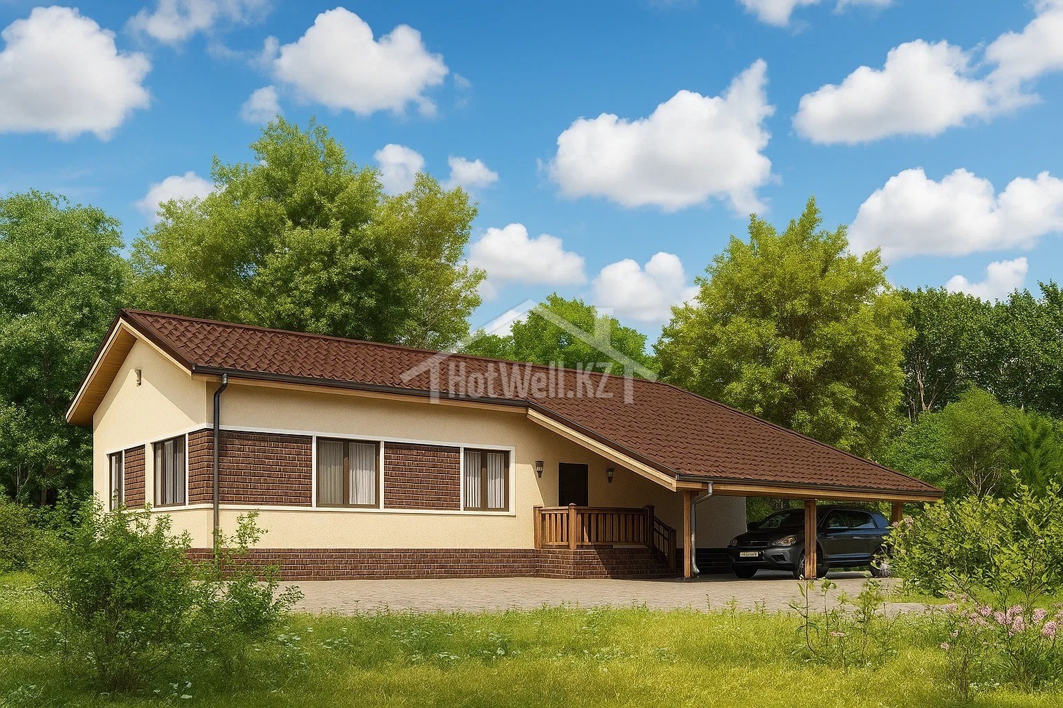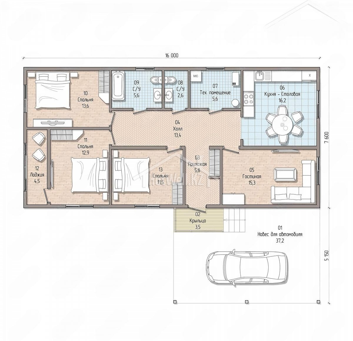 Одноэтажный дом 16 на 13 метров, общей площадью 163 м2, из СИП панелей, с бойлерной, навесом и спальней на первом этаже.