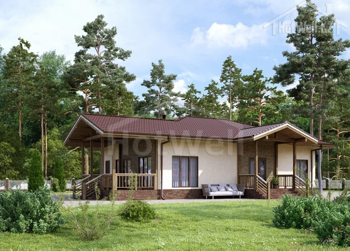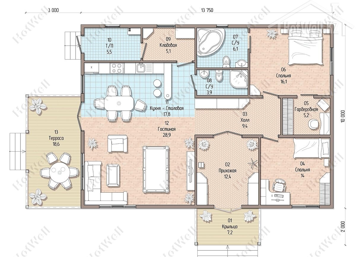 Одноэтажный дом 17 на 12 метров, общей площадью 163 м2, из СИП панелей, с бойлерной, террасой и спальней на первом этаже.