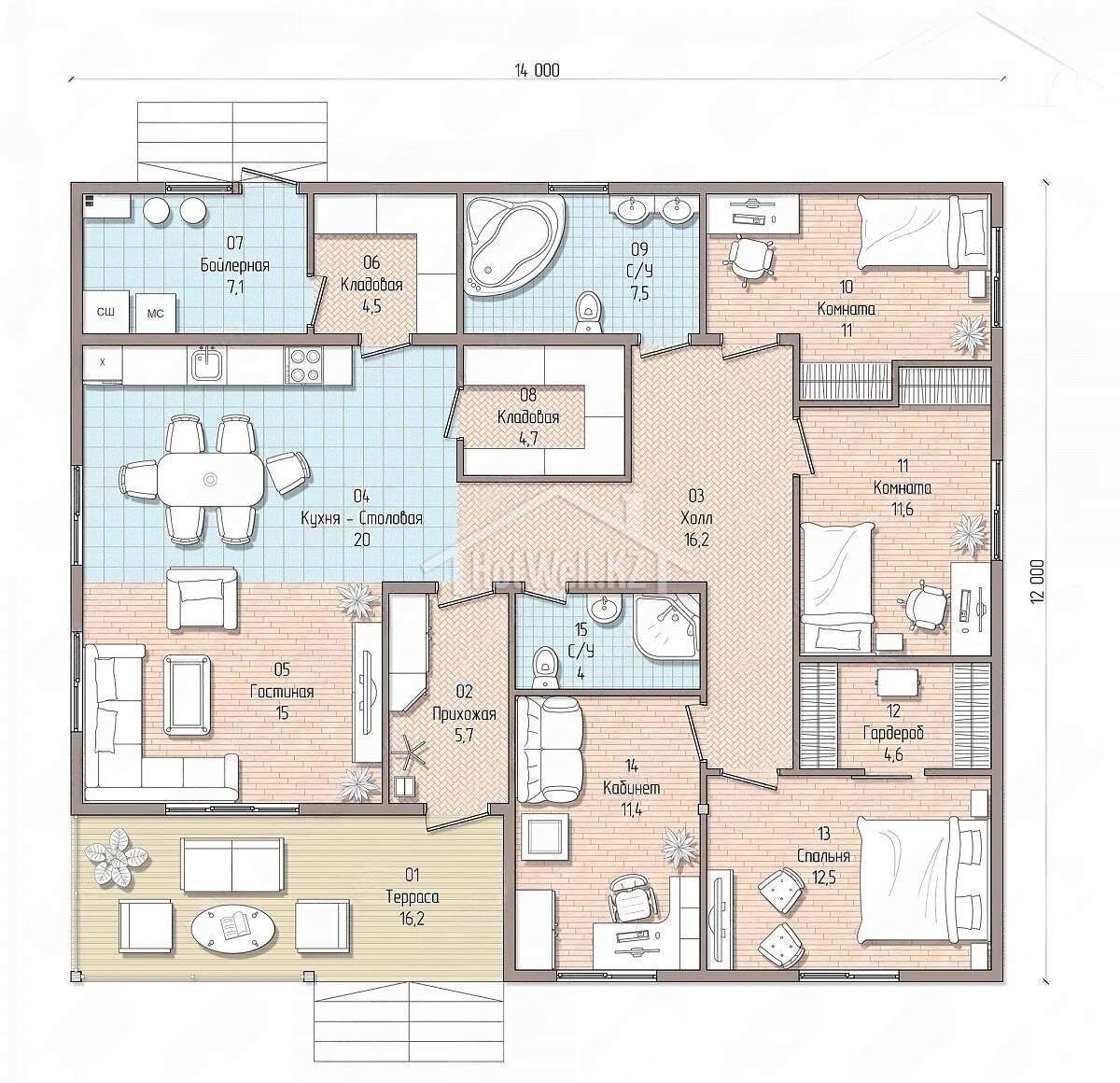 Одноэтажный дом 14 на 12 метров, общей площадью 168 м2, из СИП панелей, с бойлерной, террасой и спальней на первом этаже.