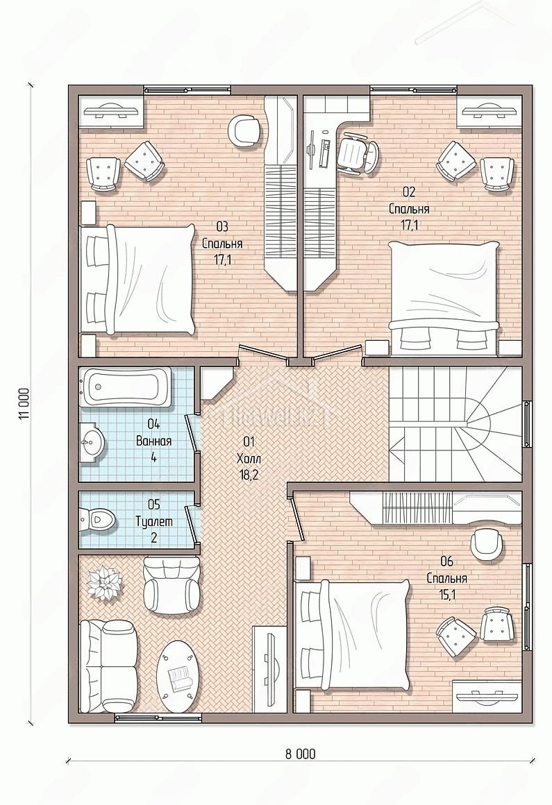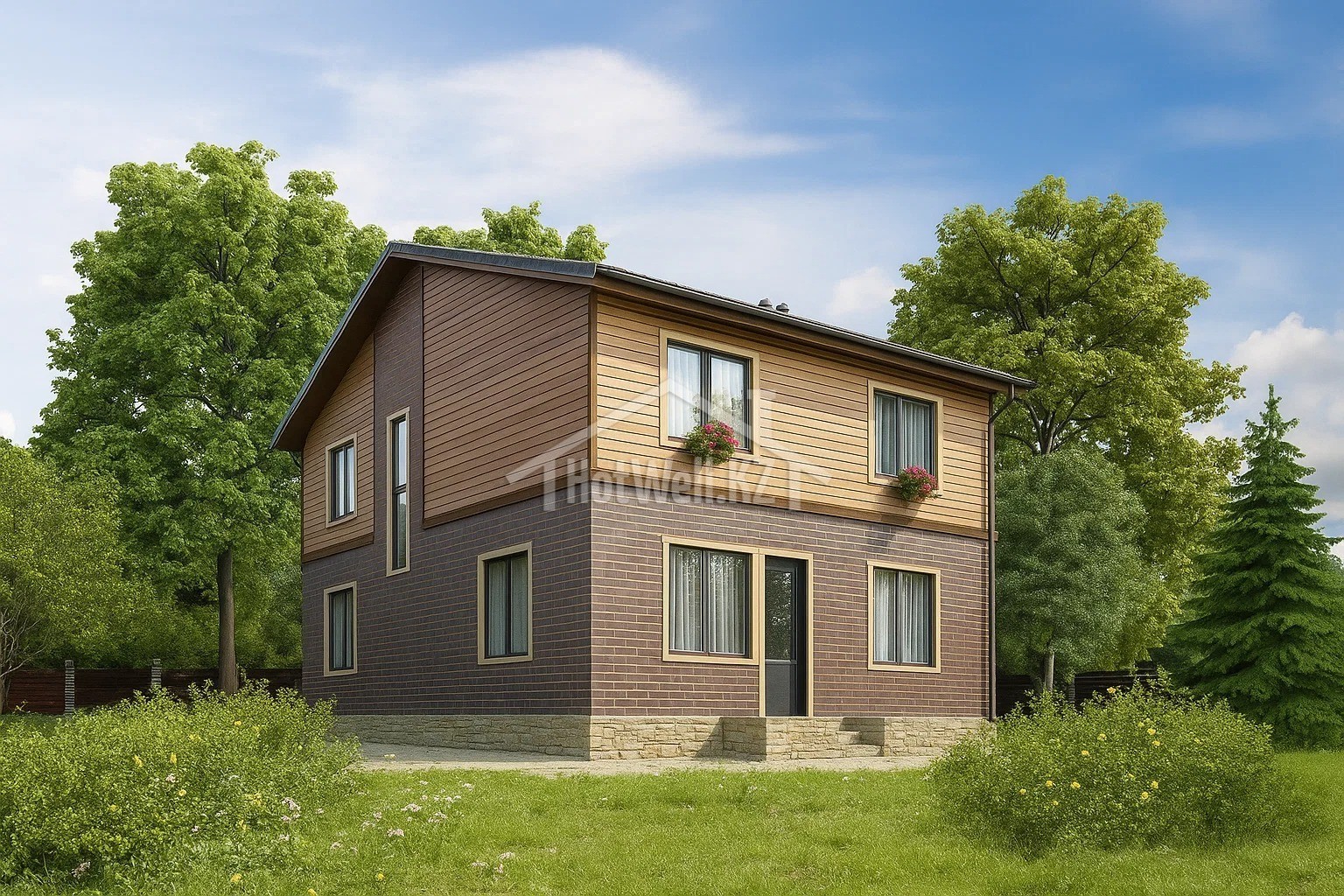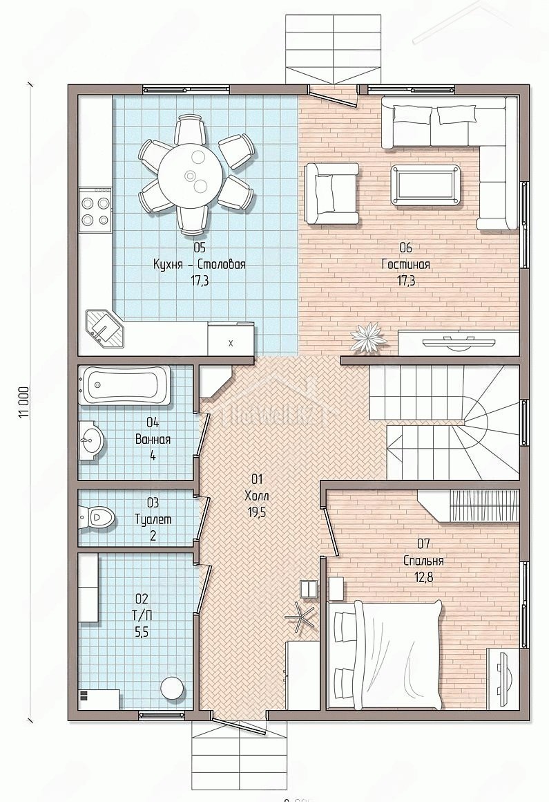 Двухэтажный дом 11 на 8 метров, общей площадью 176 м2, из СИП панелей, с бойлерной и спальней на первом этаже.