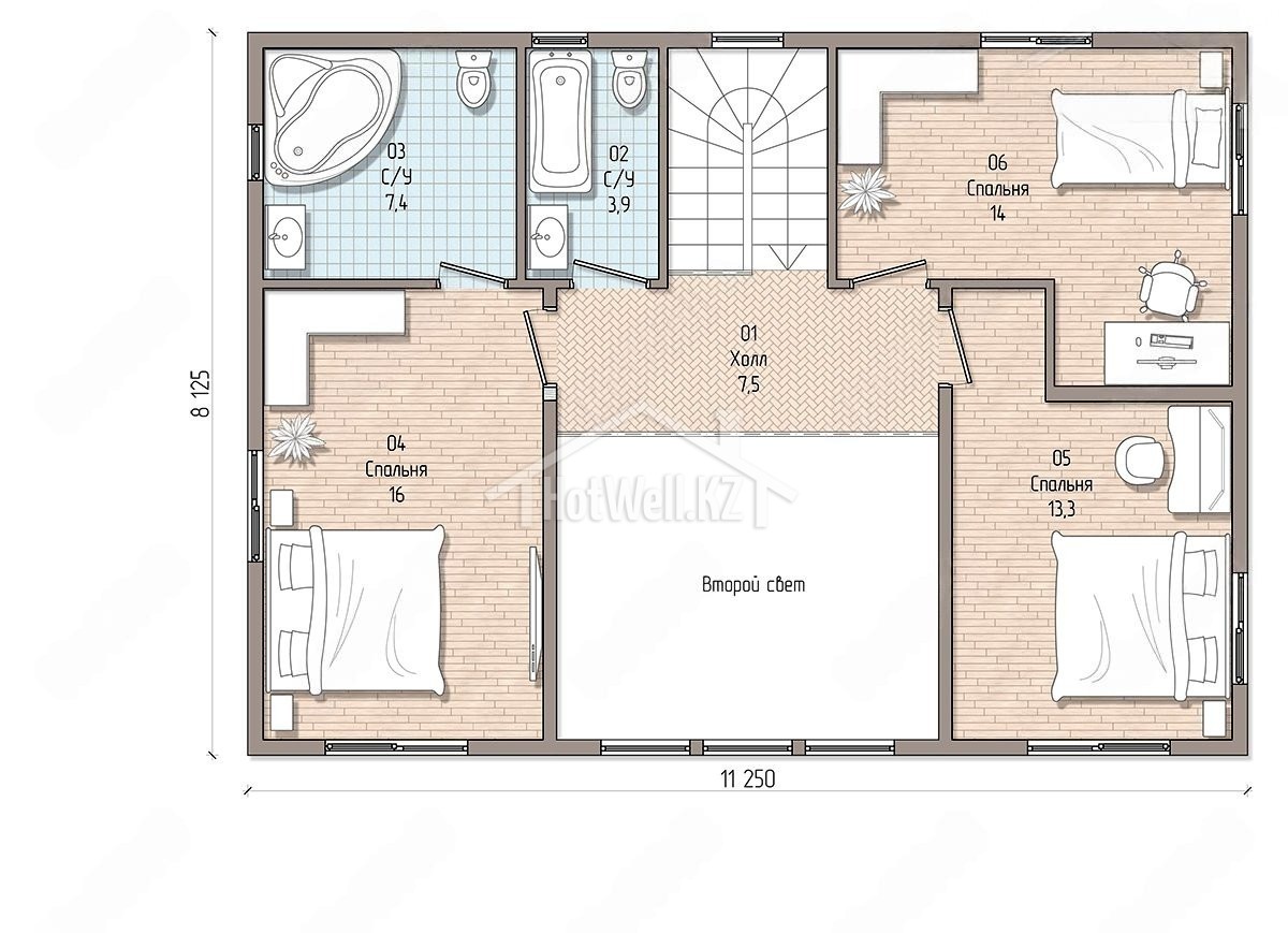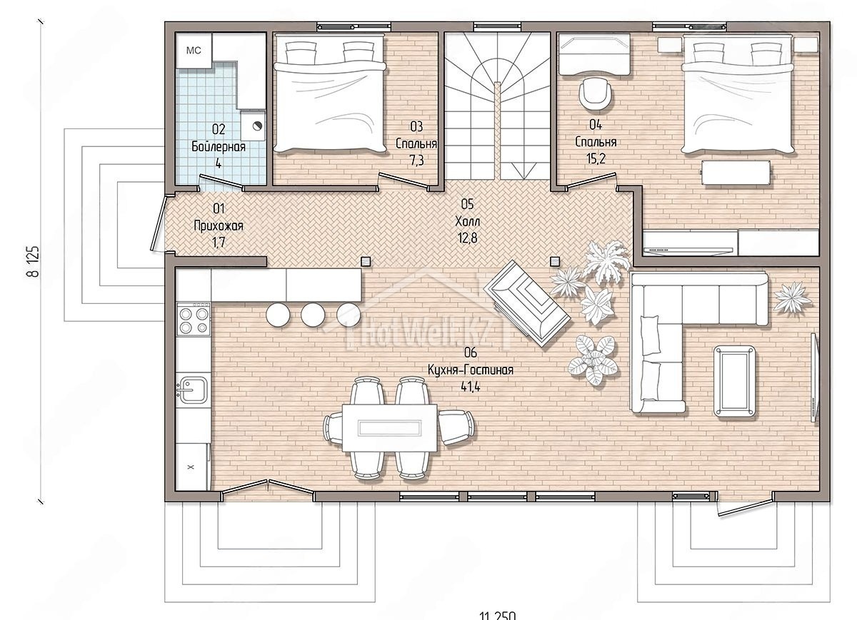 Двухэтажный дом 11 на 8 метров, общей площадью 183 м2, из СИП панелей, с бойлерной, вторым светом и спальней на первом этаже.