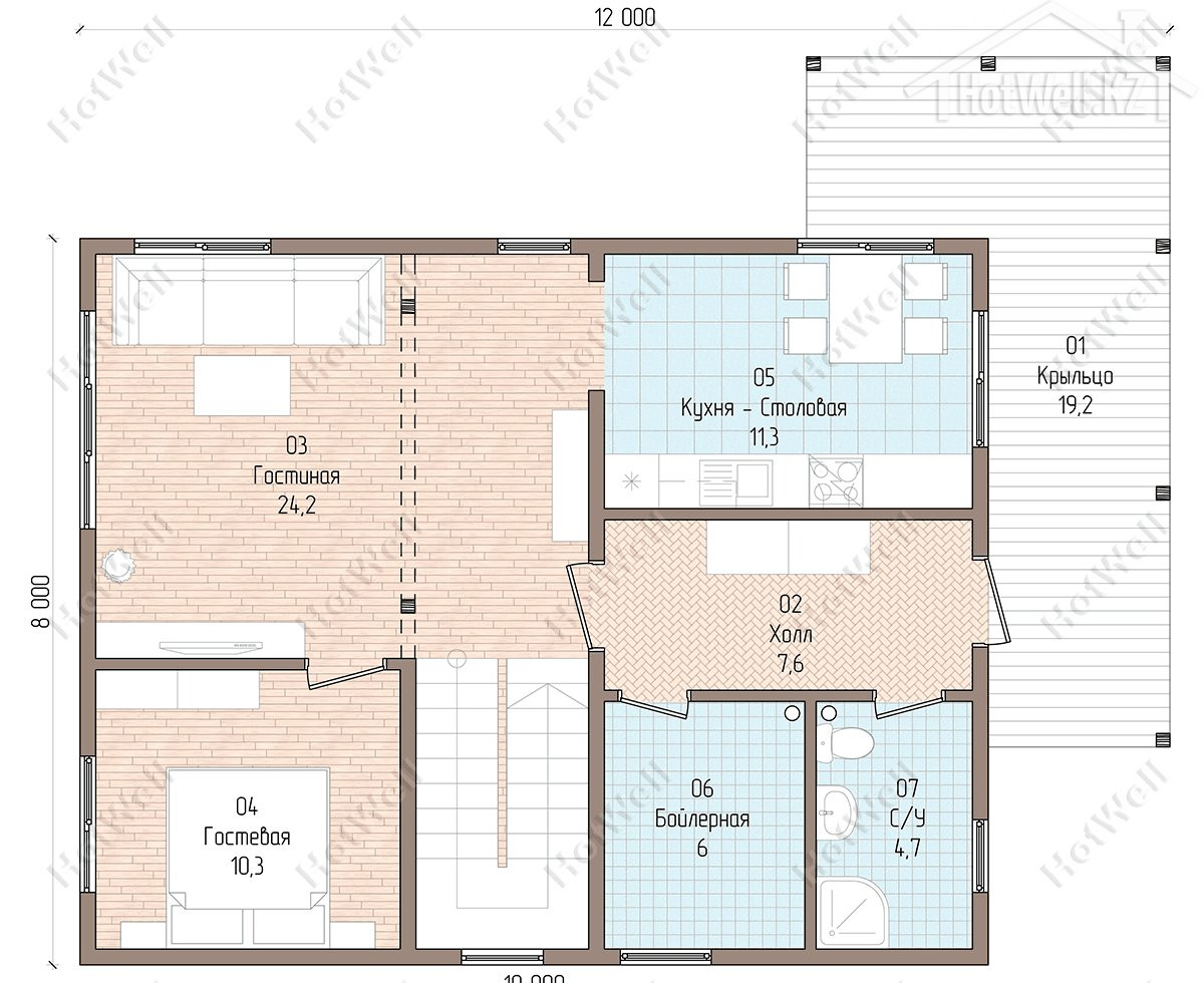 Двухэтажный дом 12 на 10 метров, общей площадью 185 м2, из СИП панелей, с бойлерной и спальней на первом этаже.