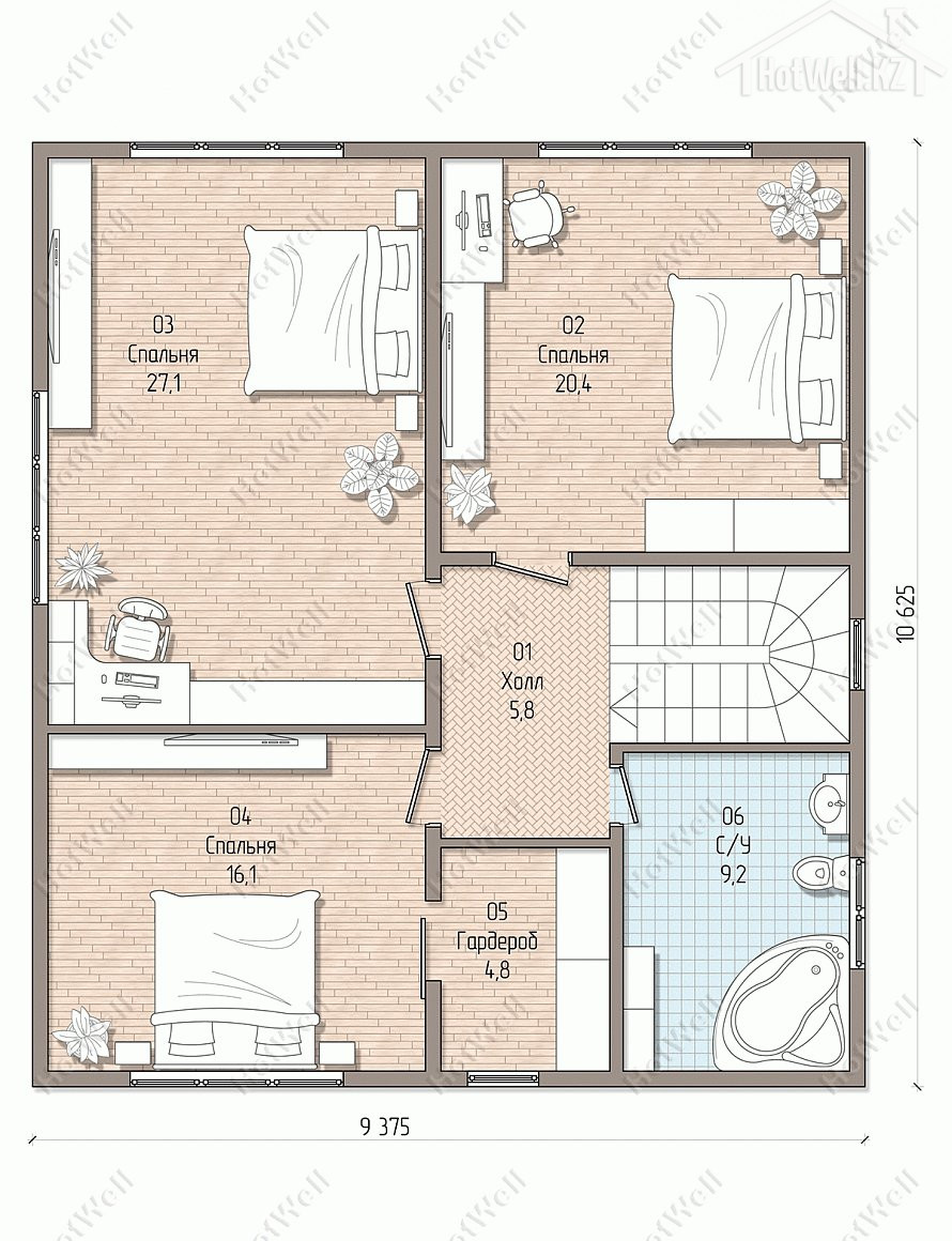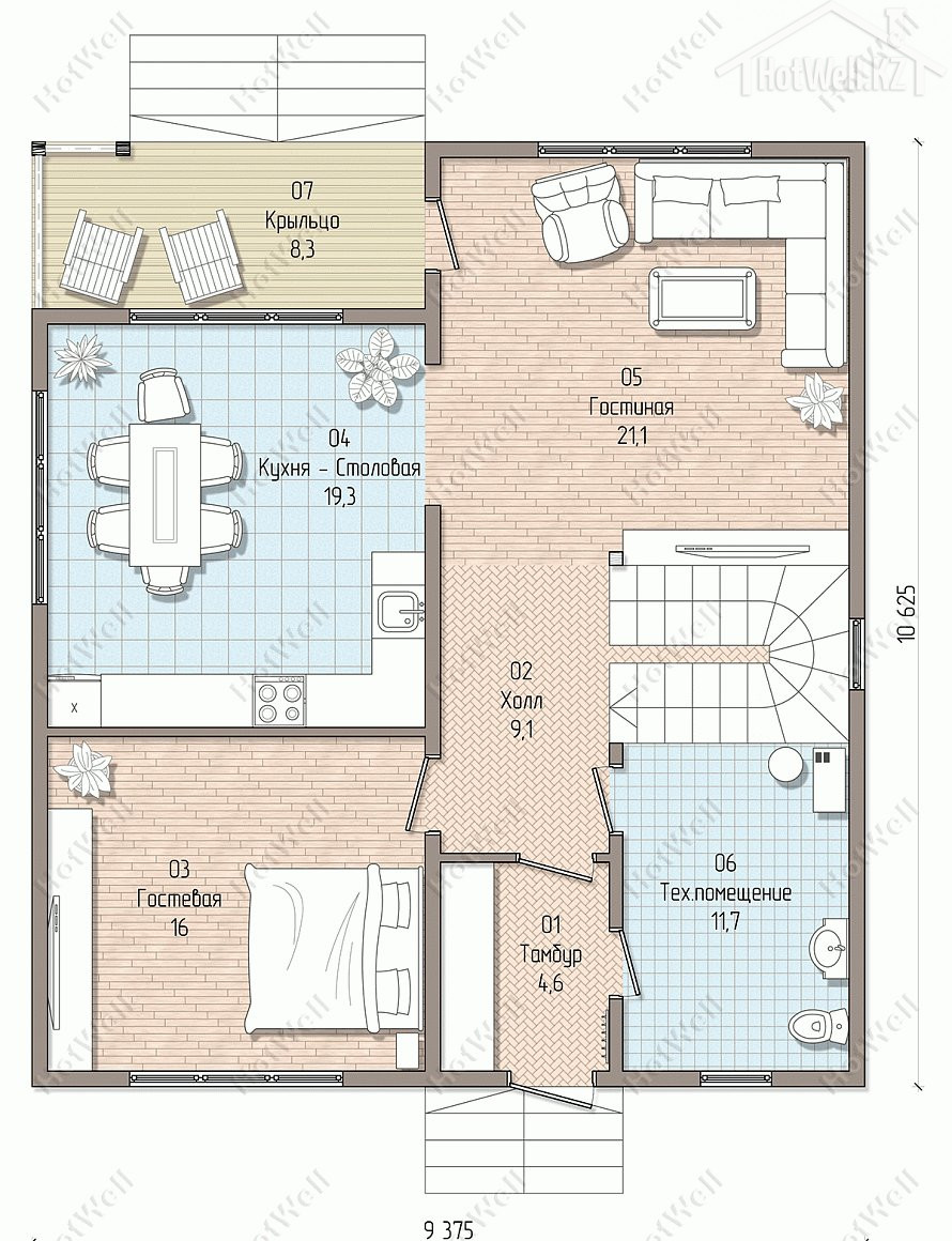 Двухэтажный дом 11 на 9 метров, общей площадью 199 м2, из СИП панелей, с бойлерной и спальней на первом этаже.